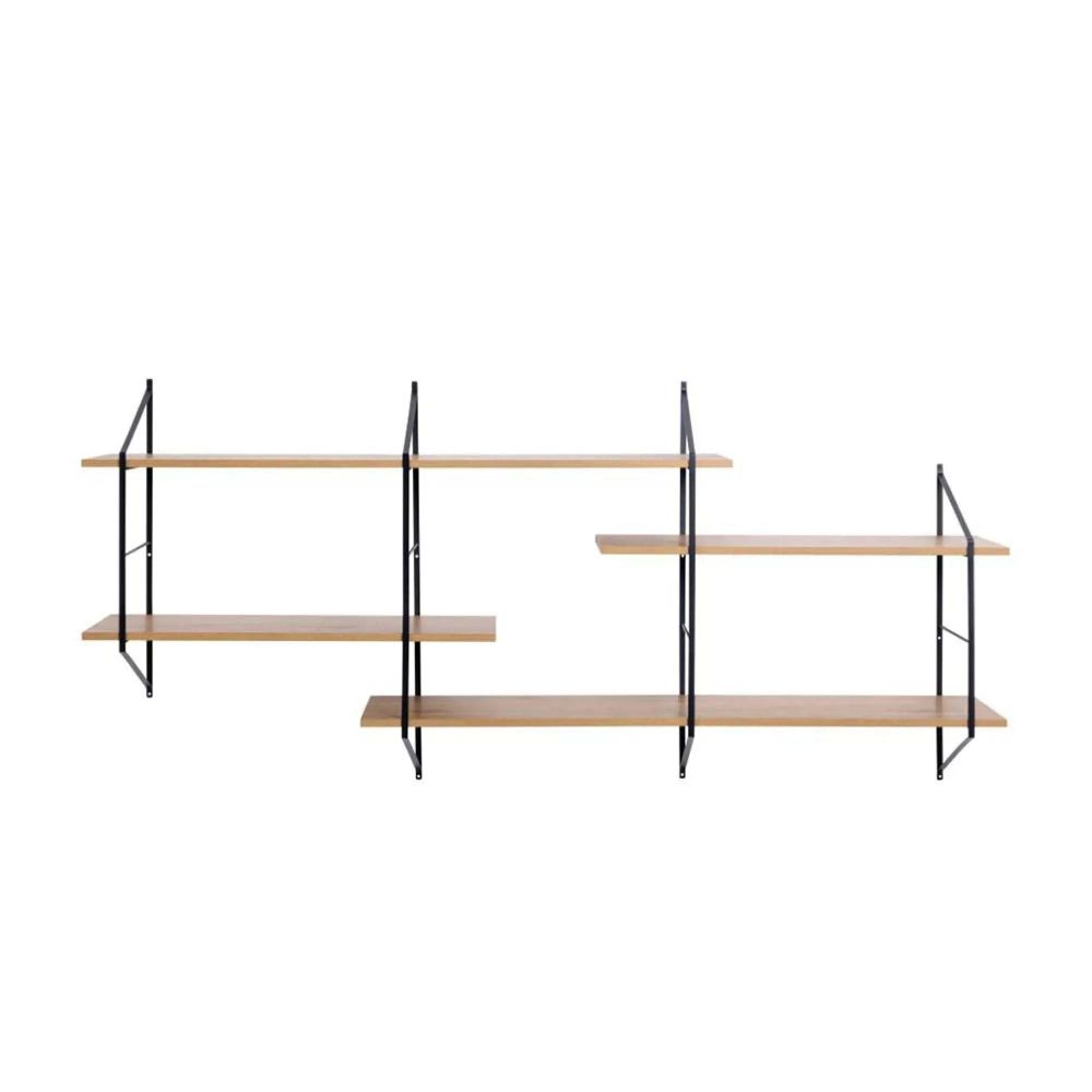 Belfast rectangular wall shelf, frame matt black powder coated steel, 4 shelves matt wild oak rough melamine with asymmetrical detail, 191x25.5x79 cmMeet a modern and rustic wall shelf that works with asymmetry and contrast to draw attention to the displayed objects. Inspired by the blend of industrial and japandi styles, the shelf is made of a thin black metal frame and 4 adjustable shelves in a wild oak look. Such a combination sets a cosy atmosphere in any home.