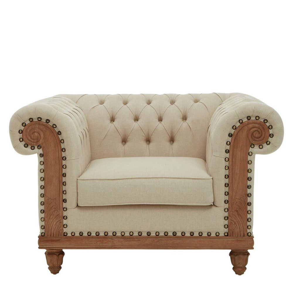 Item Code: 5527856 This elegant cream fabric armchair boasts a classic Chesterfield design with button-tufting, rolled arms, and stud detailing. This classic armchair brings timeless elegance and luxurious comfort to any space. It is upholstered in a cream fabric and showcases a distinctive Chesterfield design, evident in its button-tufted backrest and gracefully rolled arms. Adding to its traditional charm, the chair features decorative stud detailing along the front of the arms and stands on elegant mahogany wood legs, completing its sophisticated appeal.
