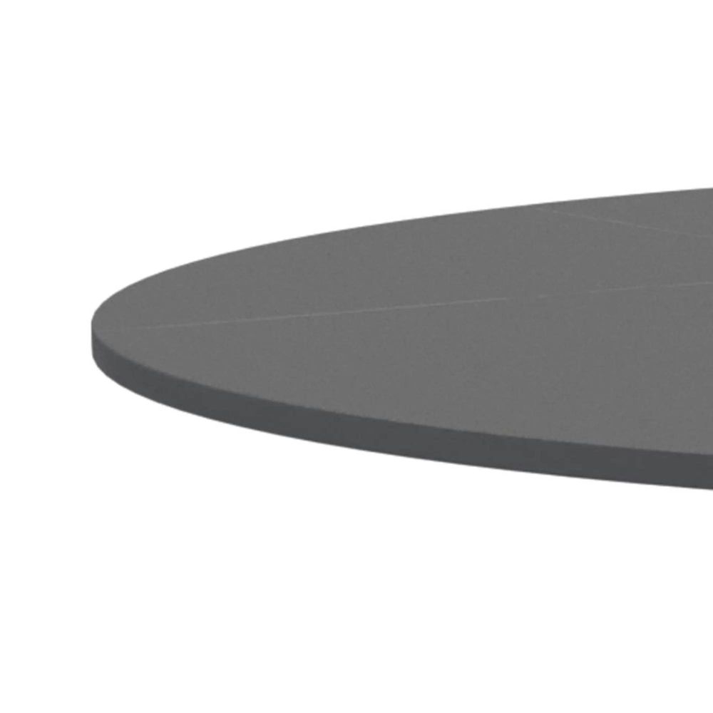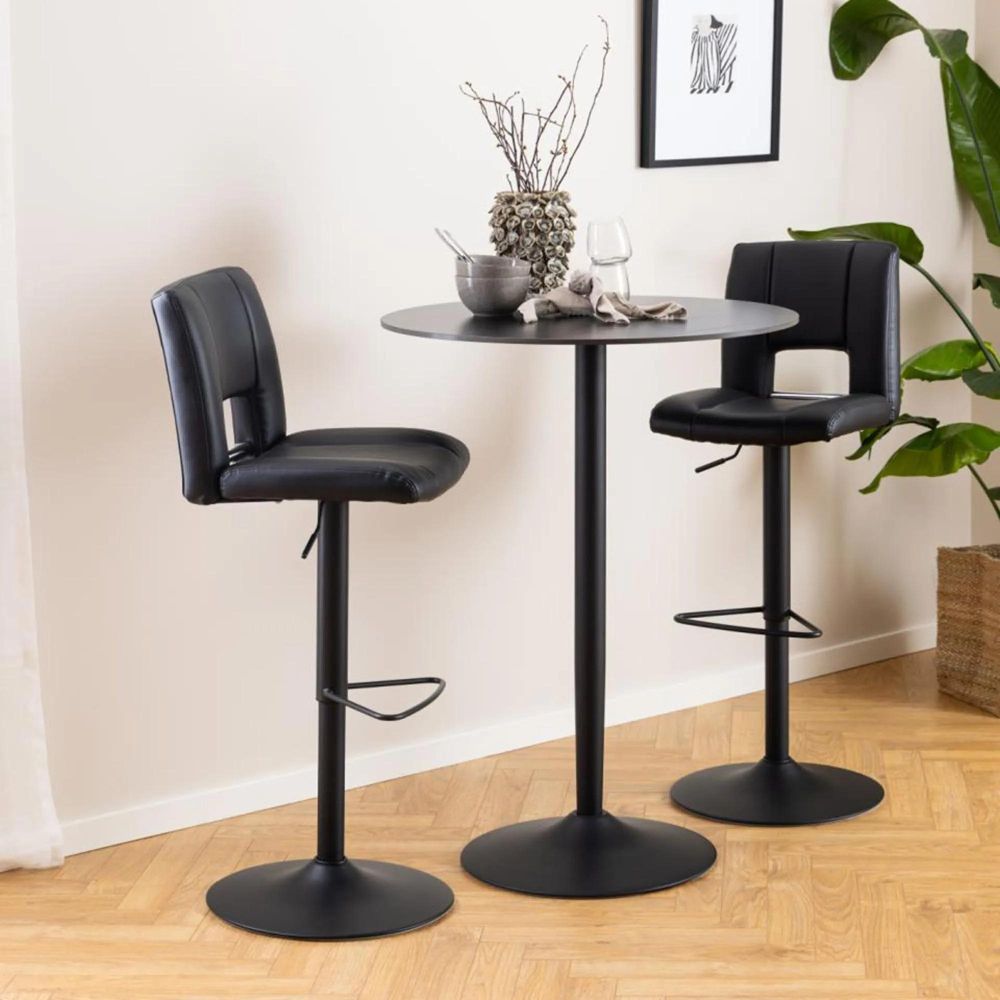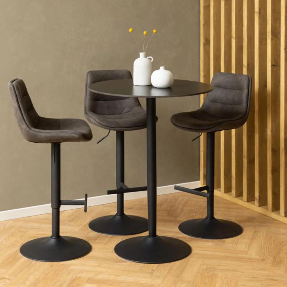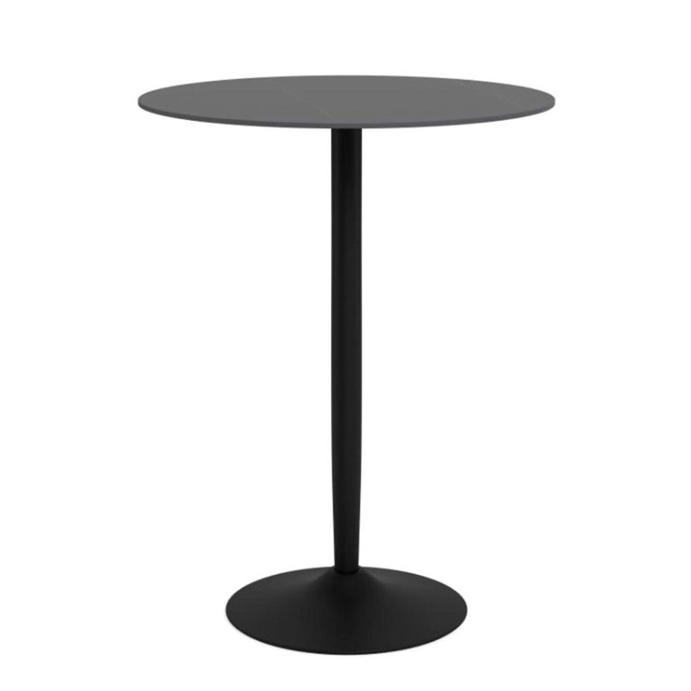 Malta round bar table, top matt black Grantham ceramic, trumpet base matt black rough powder coated steel. This black bar table might be modest in size, but it still abounds with a big personality. Its round shape helps to utilise space in any home, especially in smaller ones. The ceramic tabletop, with contrasting streaks, and slim round steel base make the table both practical and captivating piece of furniture. Tabletop made of heat and scratch resistant ceramic. FSC certified.Free Delivery