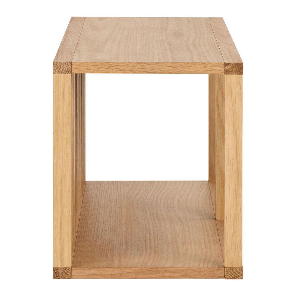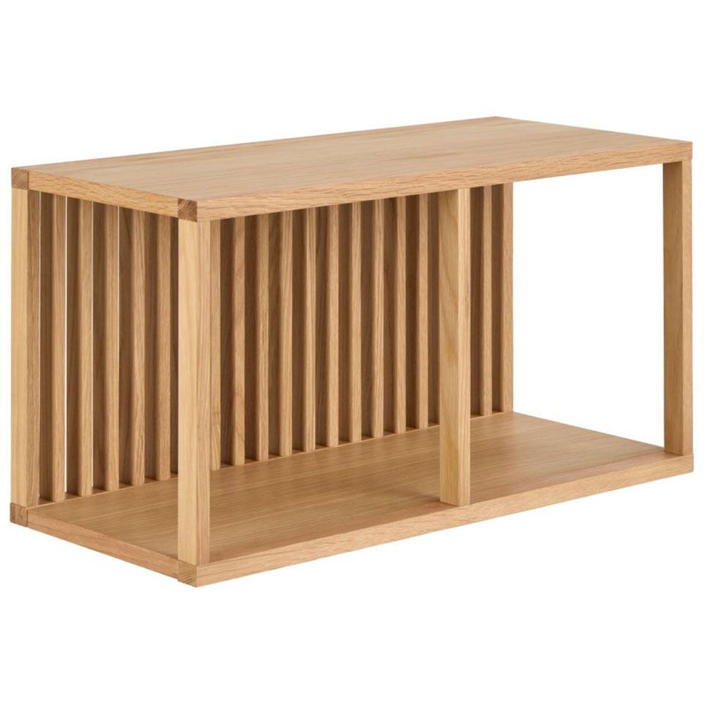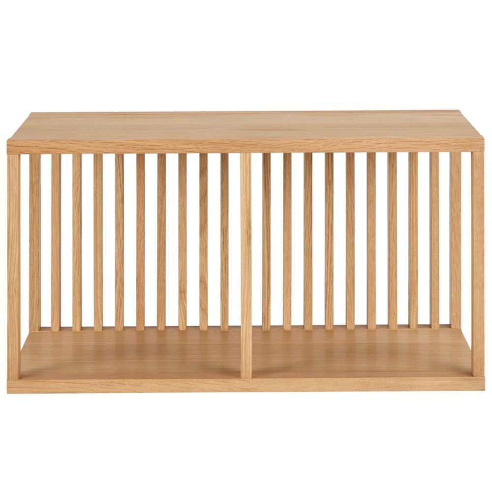 Wellington square wall shelf, frame and 2 shelves oak oiled veneer with wall mounting, 67x31x35.5 cmAdding warmth and texture to the walls, this wall-mounted rectangular shelf creates an intriguing focal point in any room. It is adorned in an oiled oak veneer. Featuring two shelves and slatted back panel, it brings natural charm and modern simplicity, perfect for displaying your favourite objects.