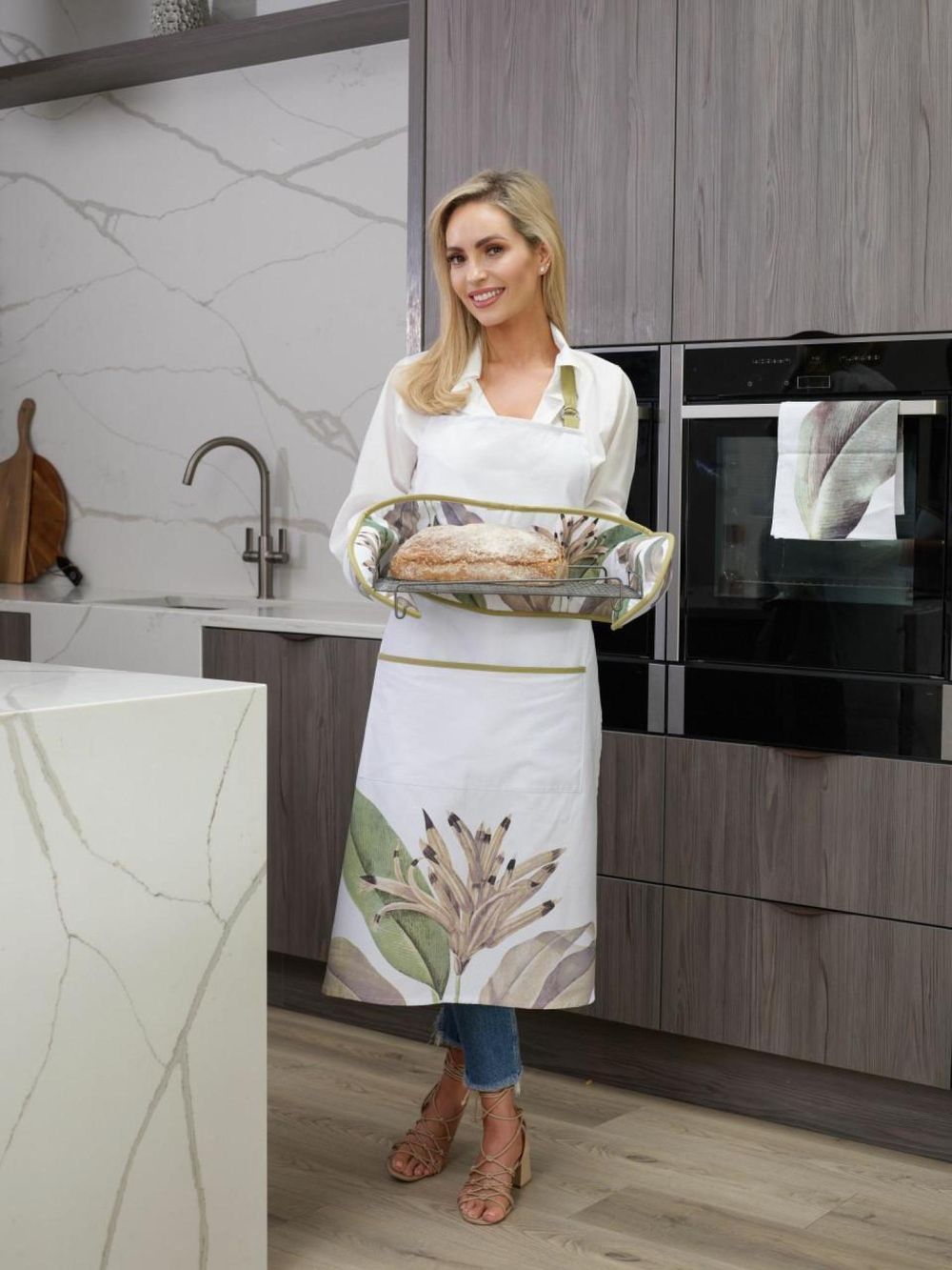 Double Oven Glove. Inspired with classic shades of green, gold & grey. Ideal house warming gift, new home, birthday, or general occasion. Part of the Birds Of Paradise Collection.