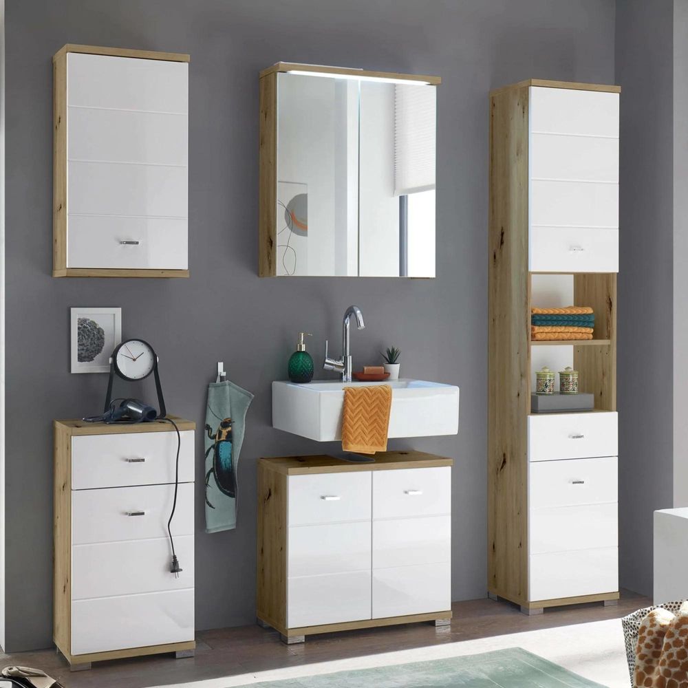 Item Code: POO001 The Pool Under Sink Cabinet effortlessly combines elegance and functionality. Made from Artisan Oak with a sleek white high gloss front and a stylish lined notch design, this cabinet is the perfect fit for any modern bathroom. It features two spacious cupboards with two large shelves, providing ample storage for all your bathroom essentials, keeping them neatly tucked away. The silver handle adds a touch of sophistication while making access easy. Maximise your space with this practical and beautifully designed under sink cabinet.