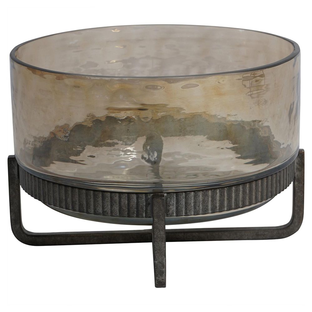 Item Code: 706601 Compact yet impactful, the Beresford Bowl On Stand is crafted from hammered glass with a gently smoked tint, bringing tactile depth and natural variation to every piece. Perfect as a fruit bowl or for serving crisps or snacks. A ribbed iron surround in antique bronze anchors the design, while the angular metal base adds a modern edge. Ideal for serving or styling. 21.3 x 21.3 x 14 cm. Style alongside other pieces from the Beresford range for a cohesive look.Free Delivery