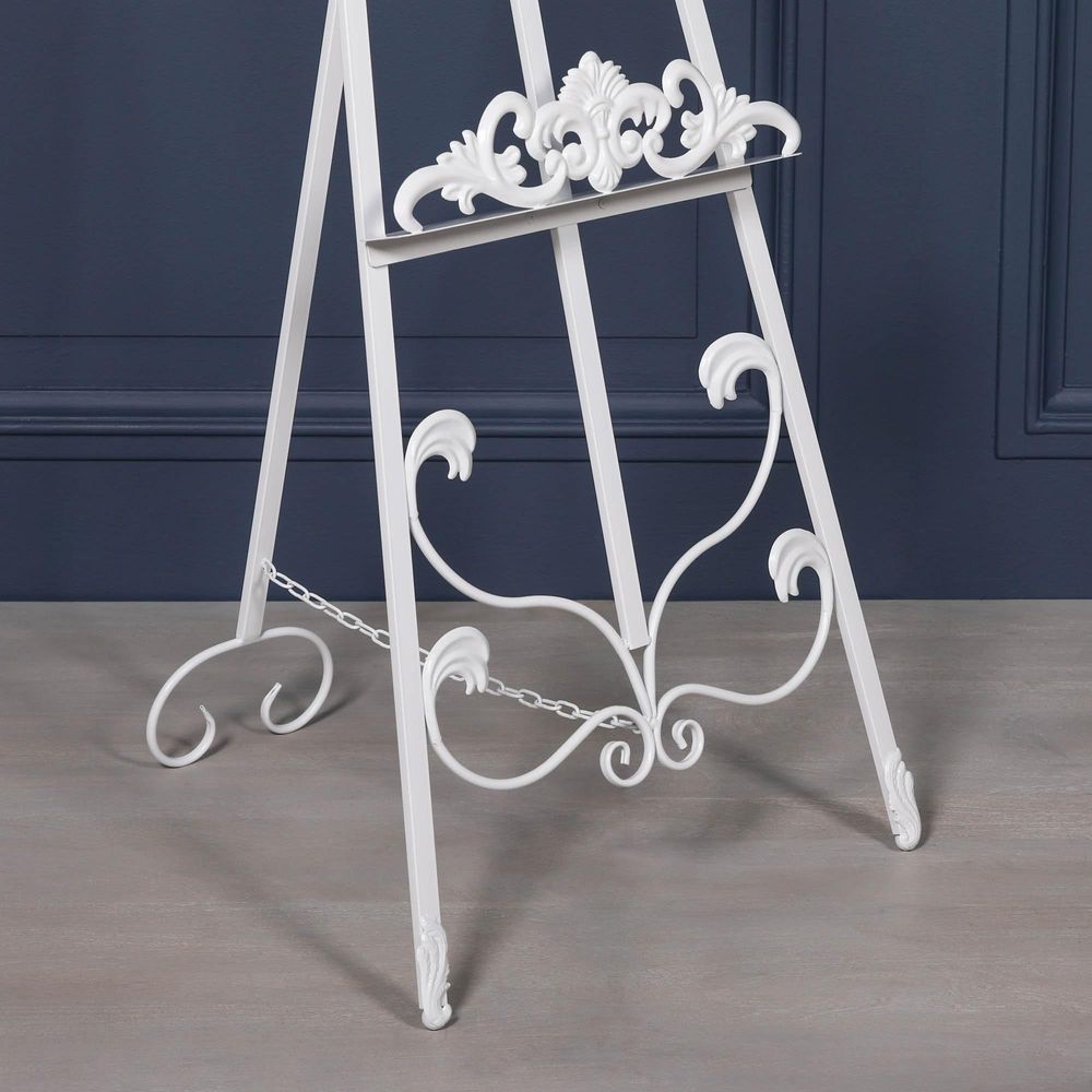 French-style 165cm metal easel in a white finish with intricate details and an adjustable shelf.