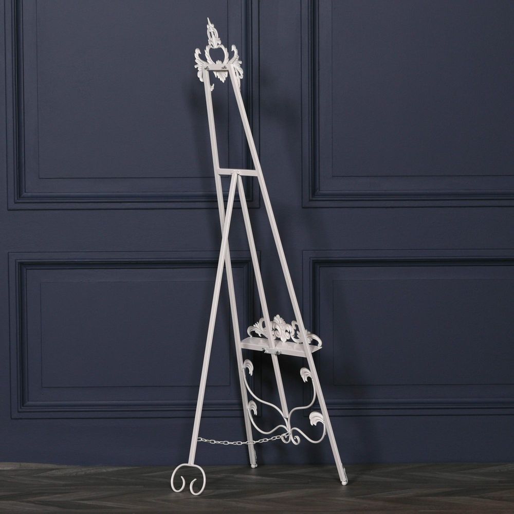 Item Code: EAS04 French-style 165cm metal easel in an antiqued cream finish with intricate details and an adjustable shelf