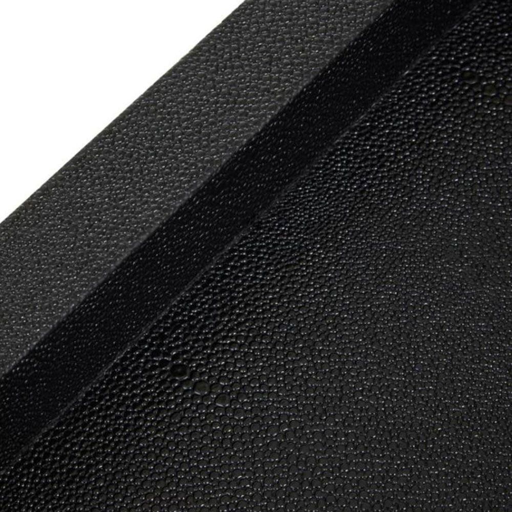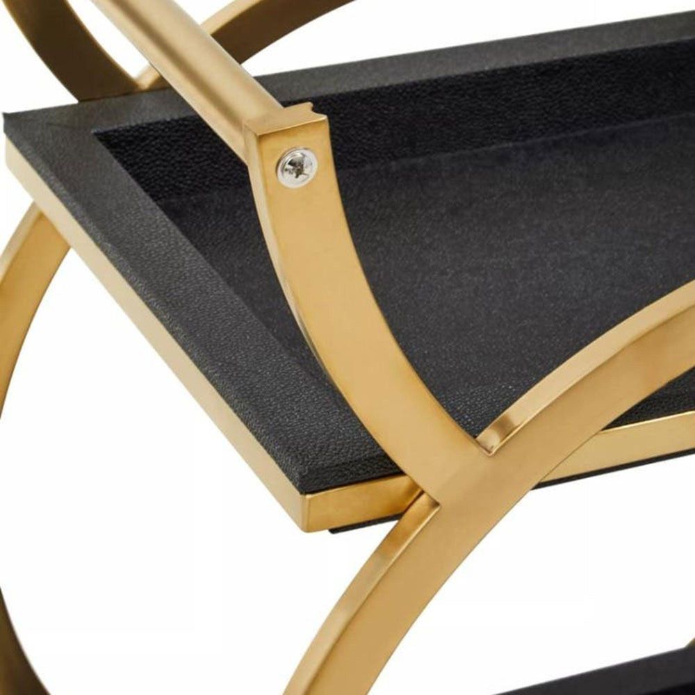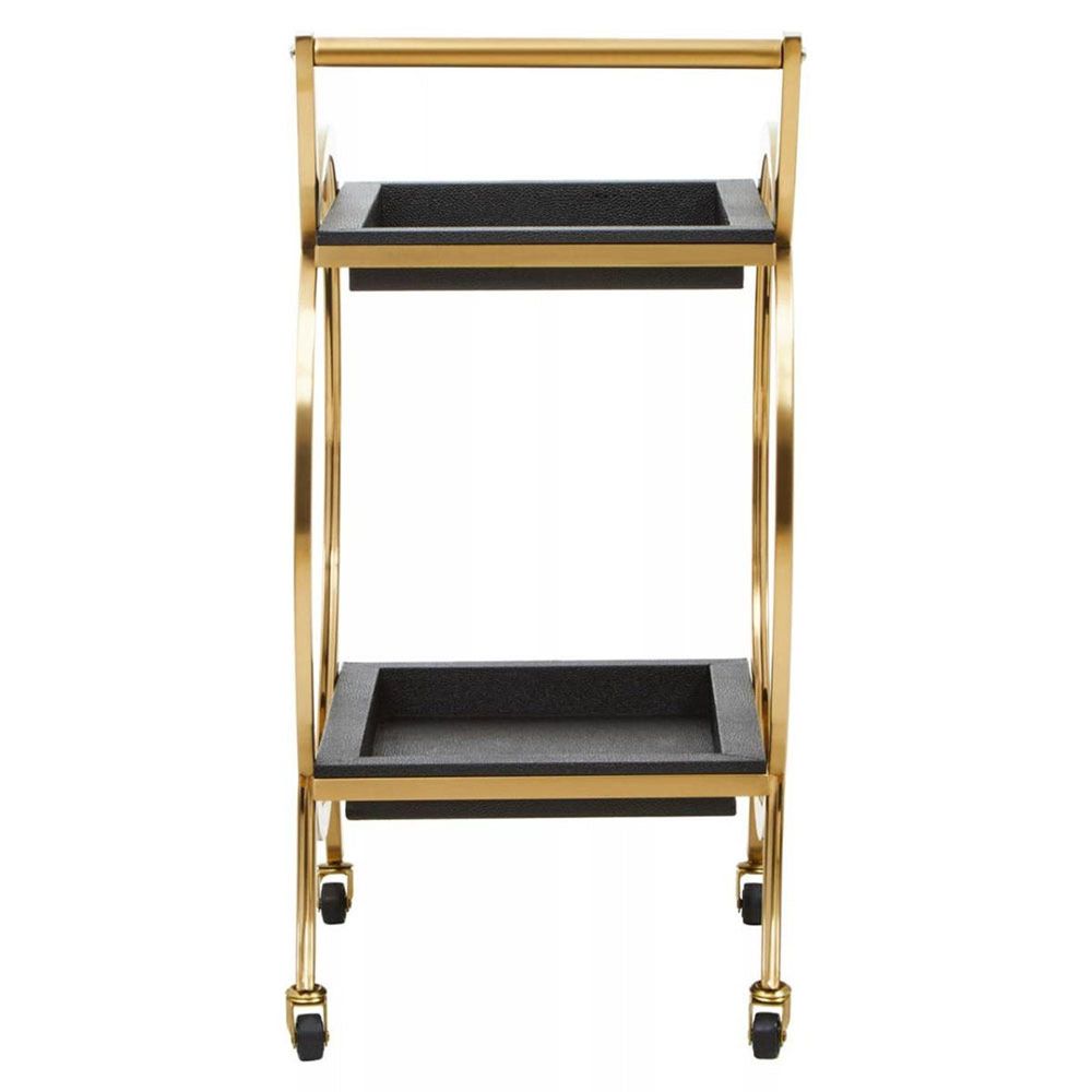 Item Code: 5528850 The Cardoba two tier serving trolley is a luxe addition to any decor thanks to its sculptural frame in a brushed matte gold finish. This serving trolley has two rectangular tiers covered in faux black shagreen that adds a touch of texture and elegance. A circular frame in a brushed matte finish contrasts with the shelves of this serving trolley, making it an ideal addition in any home.
