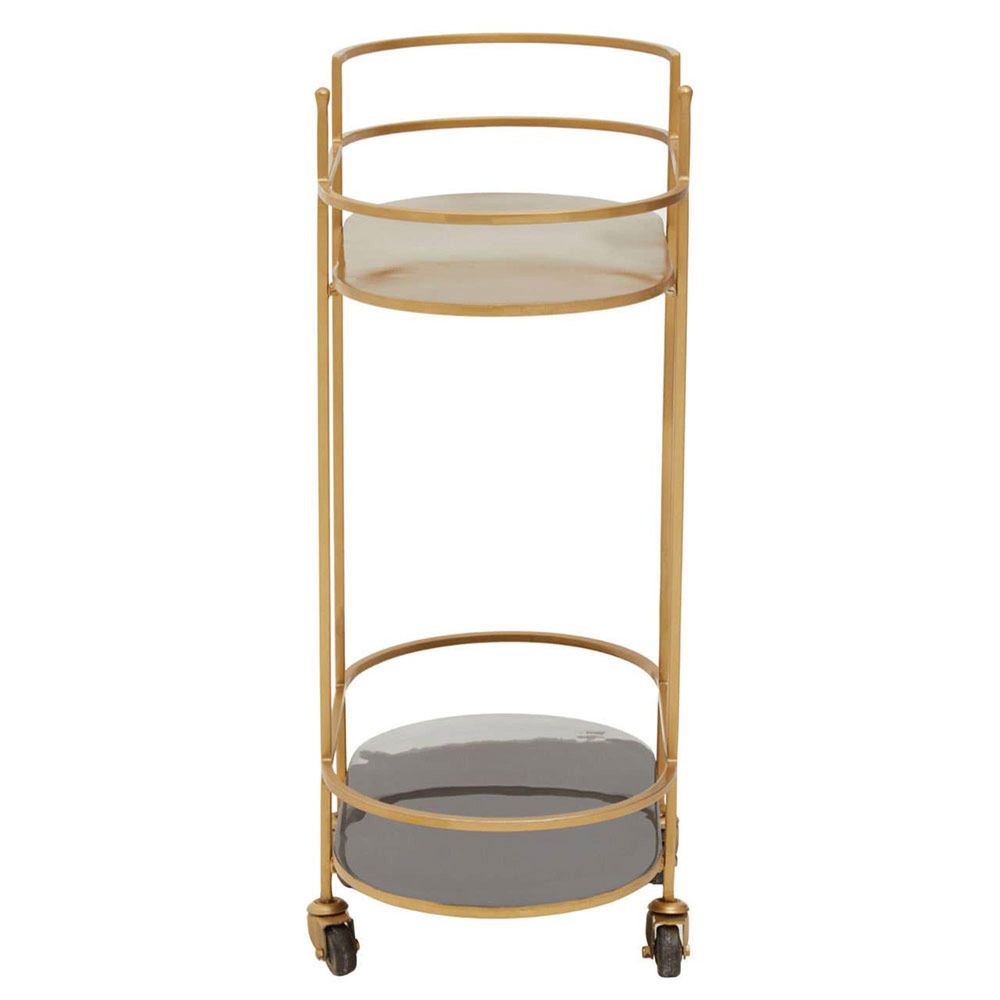 Item Code: 5528951 The geometric design of this trolley lends an art decor allure to a variety of interiors.The matte gold finish of the Korba trolley creates a chic statement to the living area. This trolley boasts a clean line slender metal frame supported by castors, and the storage shelves in a grey enamel coating are ideal for serving and organising.