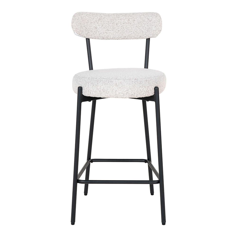 The gently curved backrest and round, padded seat, upholstered in luxurious white boucle fabric, provide exceptional comfort and support, making it perfect for everyday use or relaxed entertaining. Its sturdy steel frame, finished in matte black powder coating, adds a striking contrast that enhances its modern appeal. Whether placed by a breakfast counter or a home bar, the Badalona Barstool introduces warmth, texture, and understated sophistication to your space.