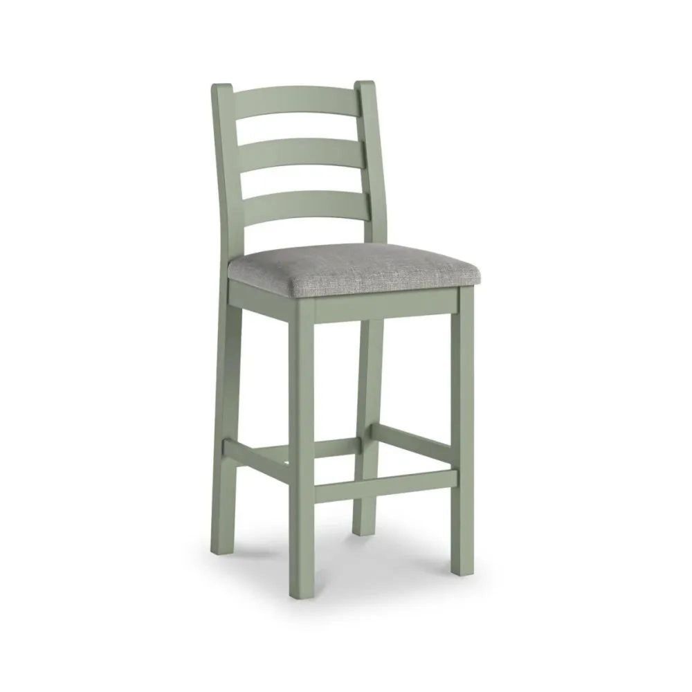Bring a touch of classic charm and sturdy craftsmanship to your kitchen or bar area with the Salcombe Sage Oak and Grey Ladder Back Bar Stool. Expertly crafted from solid oak, oak veneer, and mixed woods, these stools combine durability, comfort, and timeless style. The natural oak-finished seat top contrasts beautifully with the painted sage green and stone grey frame, offering a sophisticated country chic look that complements a variety of interiors.