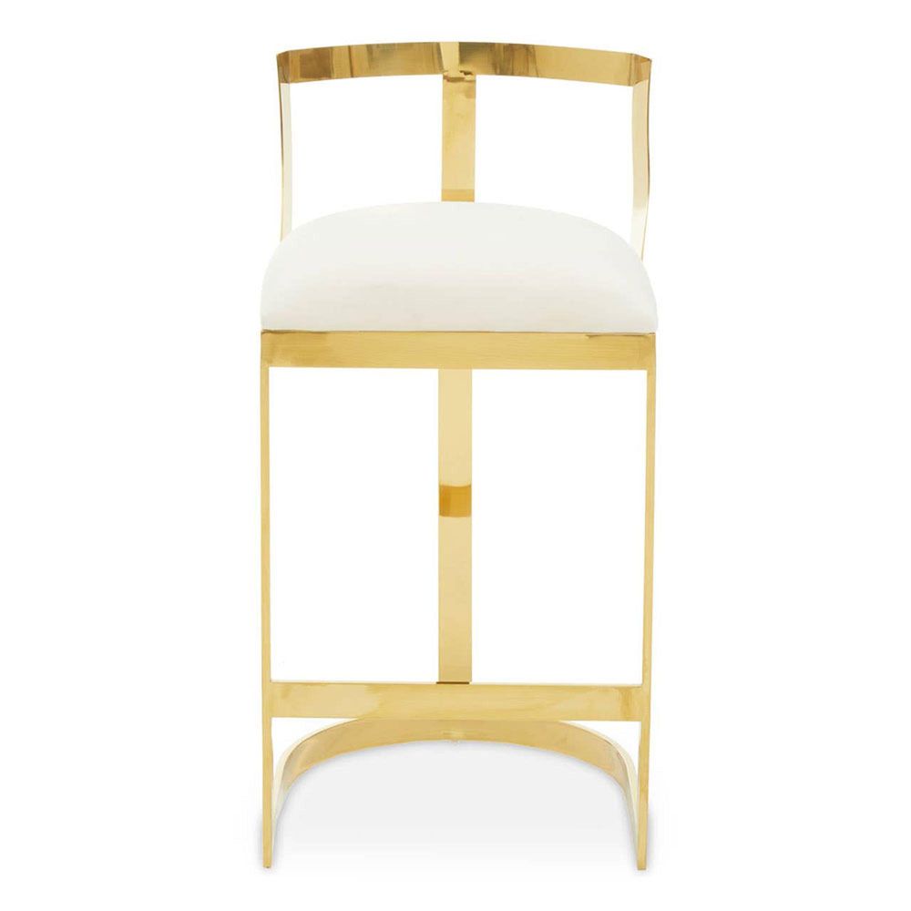 Item Code: 5528485 Azalea ivory velvet bar stool with gold finish stainless steel frame. The Azalea bar stool features a plump seat upholstered in ivory velvet supported by a curving inner backrest for added comfort. The sturdy stainless steel frame in a gold finish lends an arching accent to the decor with its sleek fixture.