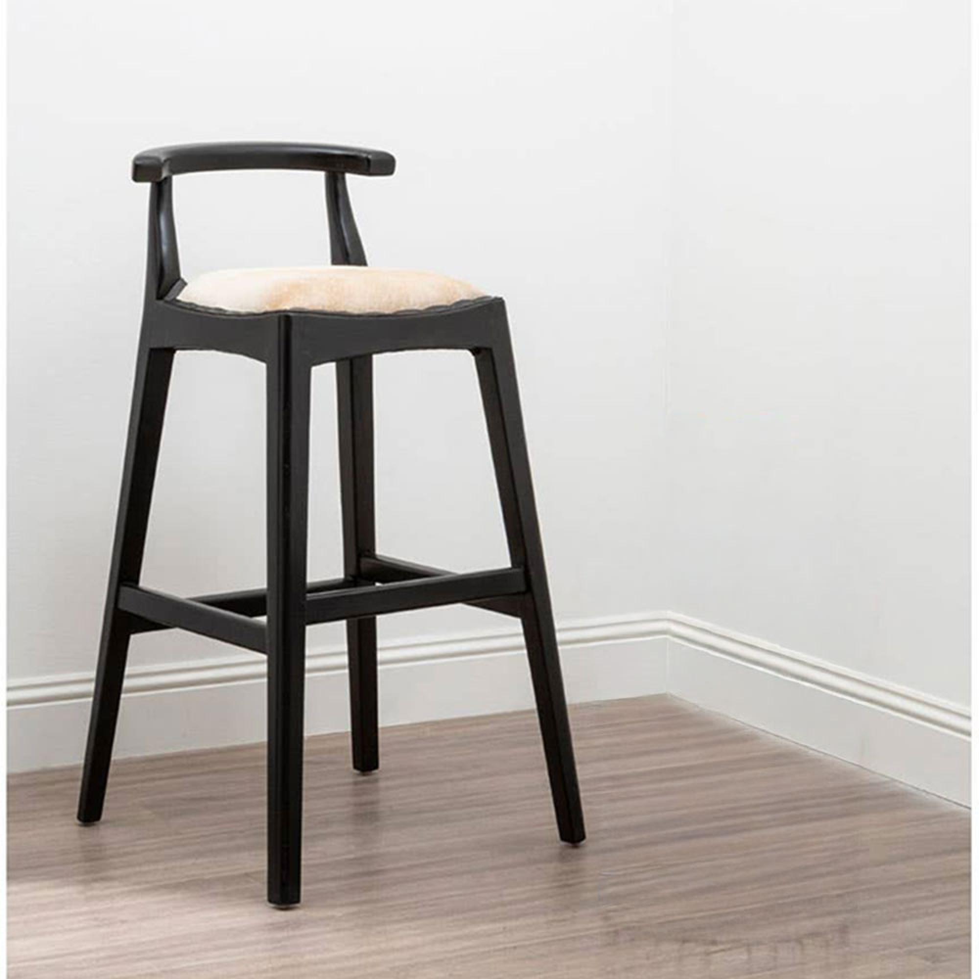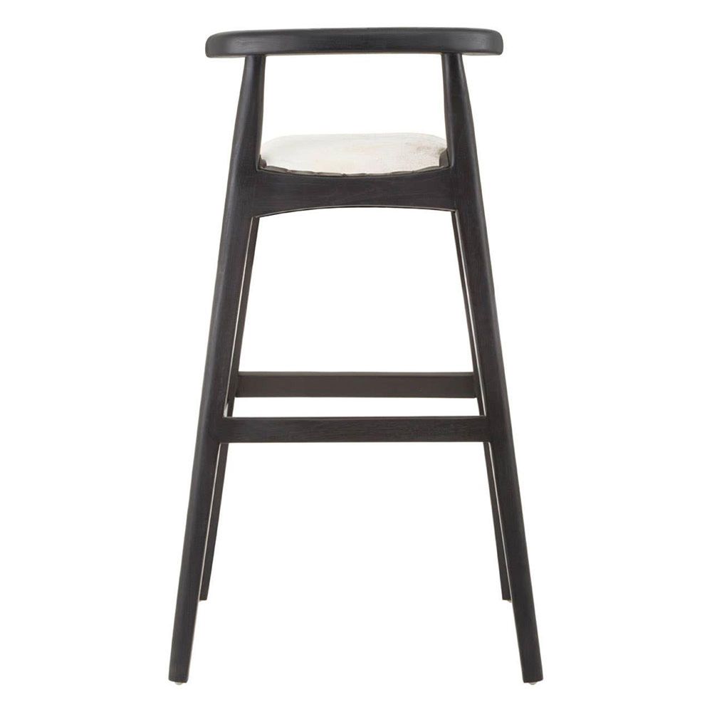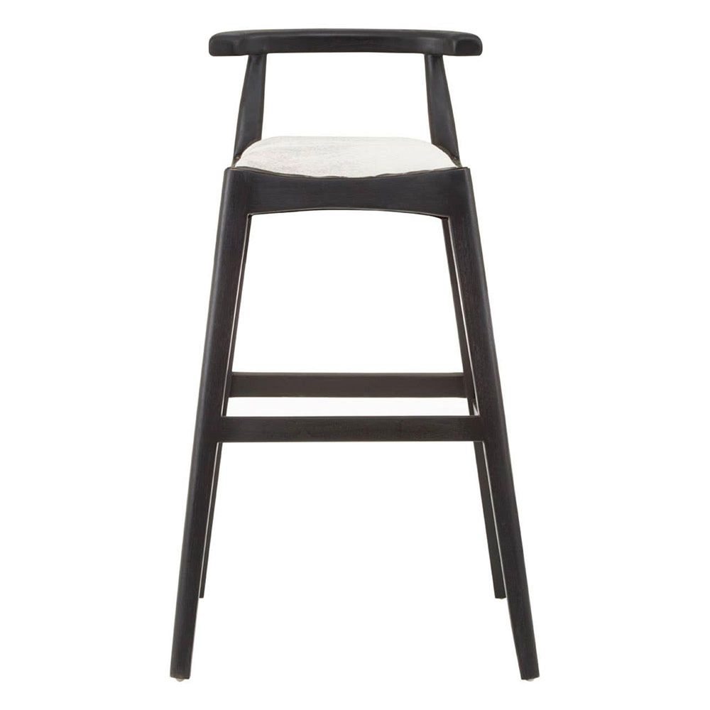 Item Code: 5527077 The Kendari bar chair with white leather seat and sleek black teak wood frame will add a cool boho nordic vibe to any space.The Kendari bar chair stool has a low profile, understated design featuring a solid teak wood frame with angular legs. The seat has genuine white leather upholstery with stud trims adding a metallic accent to the overall boho chic look.