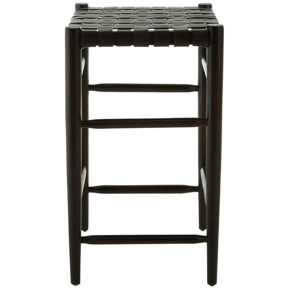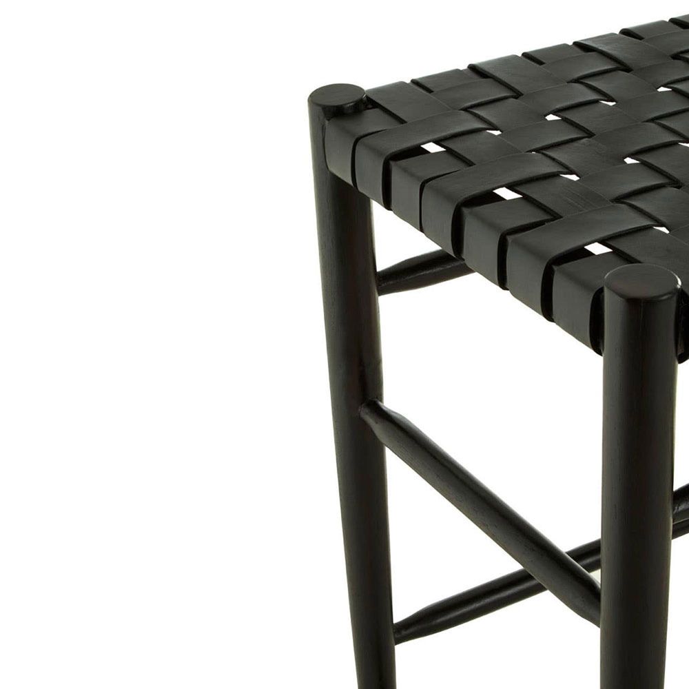 Item Code: 5527085 The Kendari barstool has a sleek design featuring a solid black teak wood frame matched with hand braided black cow leather straps.This bar stool has a stylish seat made from hand woven black cow leather straps. The interconnecting lines of the black teak wood frame add a touch of boho chic to any space, while ensuring stability to the overall design.