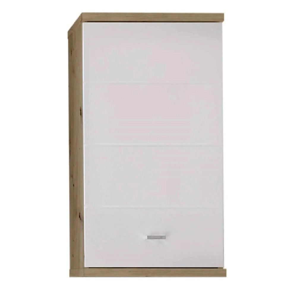 Item Code: POO004 The Pool Wall Unit brings a sleek, space-saving solution to your bathroom with its Artisan Oak build and glossy white front featuring a lined notch design. This wall-mounted cupboard has two spacious shelves behind its door, offering generous storage to keep your bathroom tidy and organised. The silver handle adds a refined touch to its modern design. Whether you're storing toiletries or essentials.