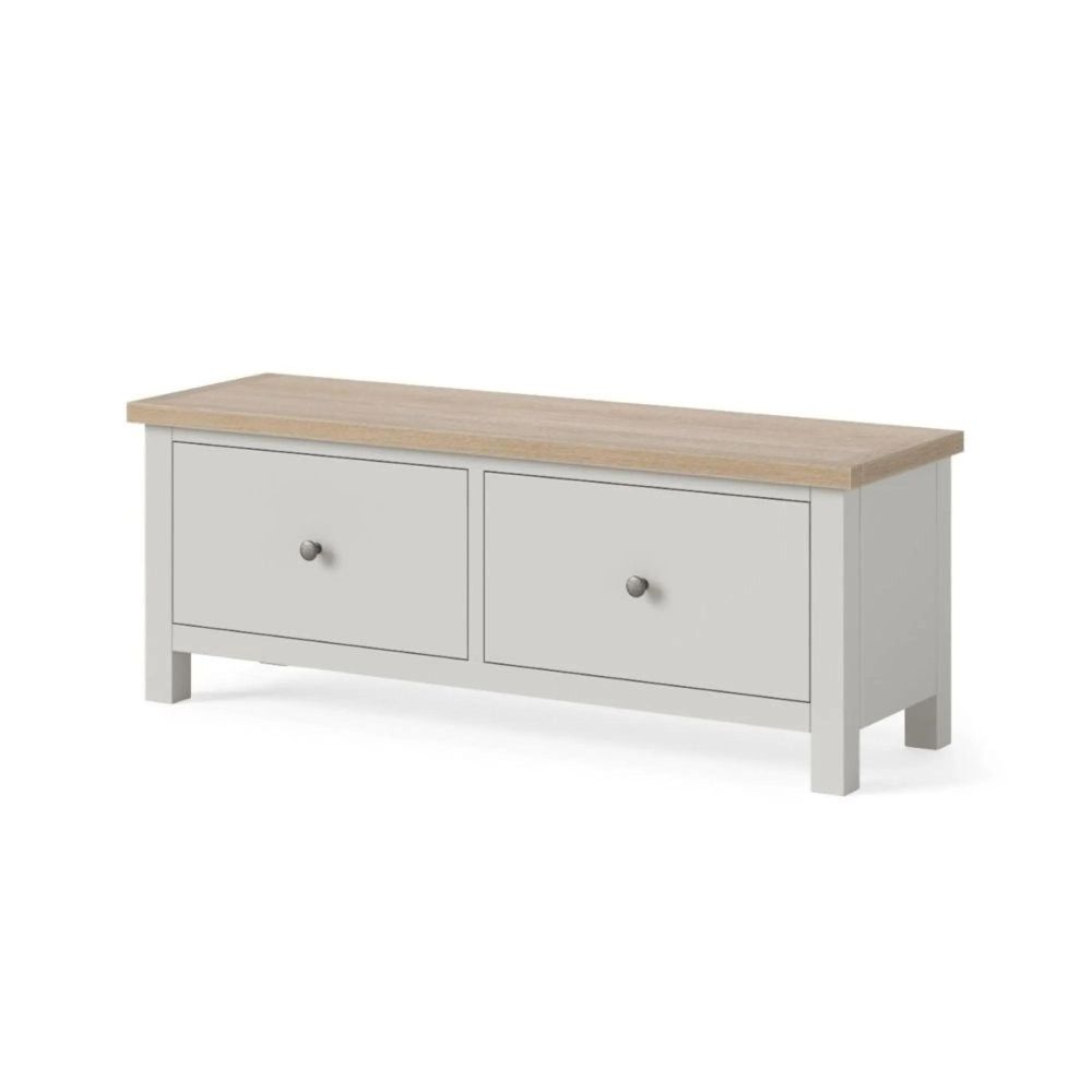 Its solid white-washed oak top provides a premium natural surface, perfectly complementing the painted frame, available in Light Grey, Coconut White, or White-Washed Oak finishes. The sturdy block legs give it a strong foundation, while two spacious drawers offer hidden storage for shoes, accessories, or everyday essentials.