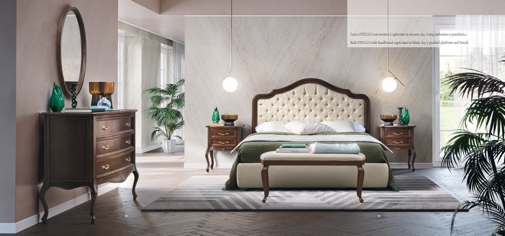 Item Code: 169SED.01NOMS128 True solid wood carved and varnished according to the Italian tradition of the furniture artisan masters.Varnishing performed by a skilful and sensitive hand achieves chromatic solutions and complex antique shades which enhance the warmth and charm of a glamourous mansion. The typical gouge and the traditional woodwork chisel by which the Venetian artisan creates delicate and enchanting wood engravings. Bed VERDI with capitonne headboard in fabric Kr.5. On the left, elegant vanity dresser with pouf and mirror. The headoard in solid wood is cut, bent hand carved and hand varnished, patinated, brushed and antique made. Both sides and bottom drawers are in birch wood to guarantee solidity and weight resistance.This is a Made to Order itemAll Made to Order items are manufactured as per the order supplied by you.We are unable to accept cancellation or accept any extra cost that may incur due to wrong information provided by you at the time you placed the order.We will confirm all sizes/colours/finishes in written email (order confirmation) with you before going ahead with production of your order.