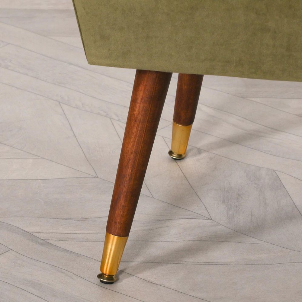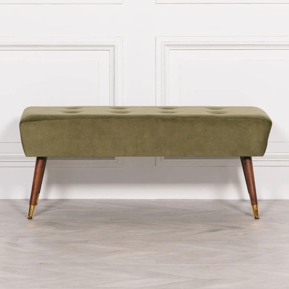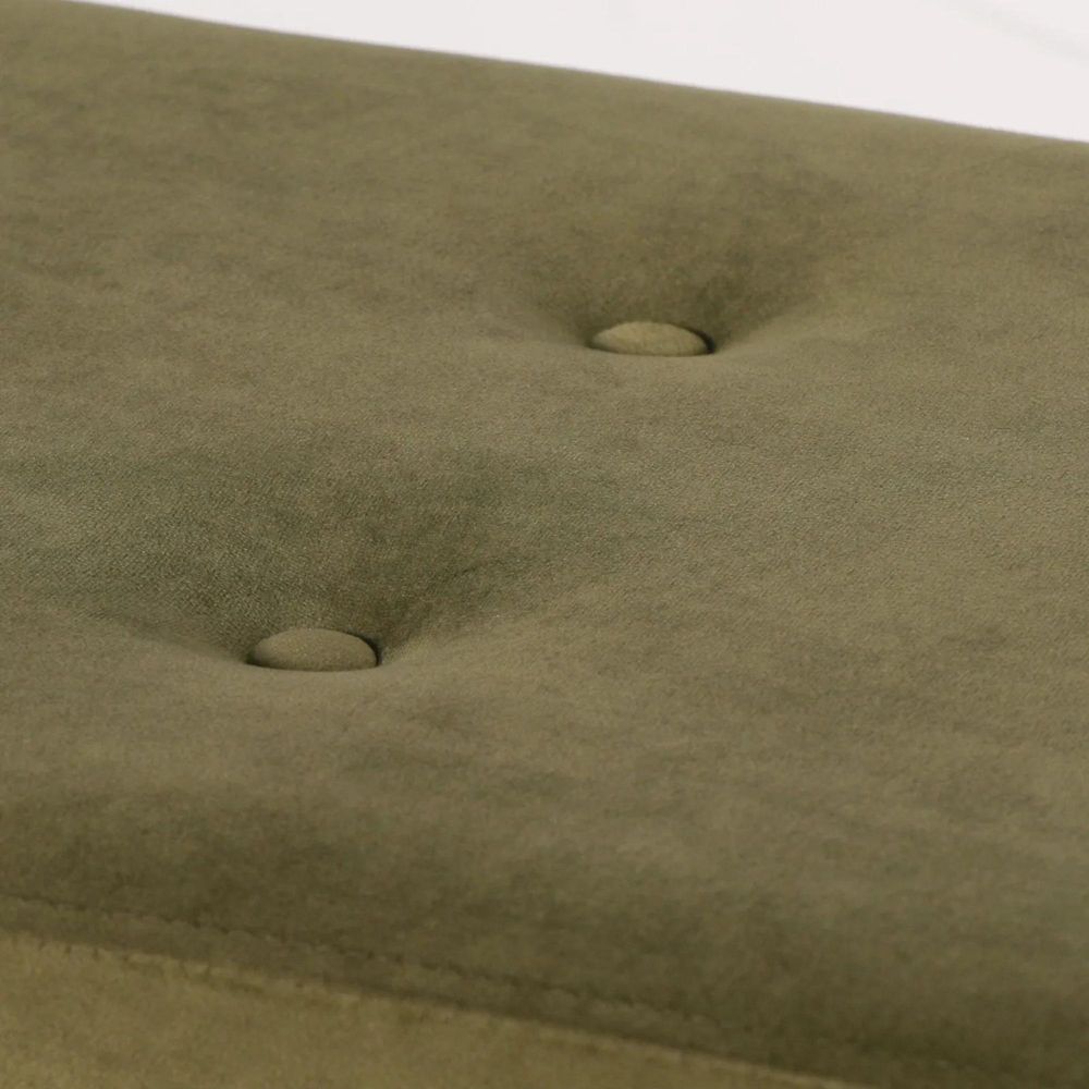Item Code: AV499 Olive green velvet ottoman stool with wooden and metal legs with a gold finish and button details.