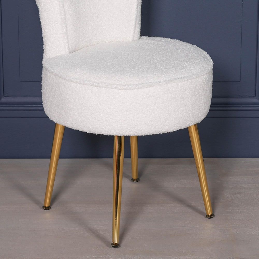 Item Code: AV104 Boucle white fabric upholstered stool / bedroom chair with button detailing and metal gold plated legs