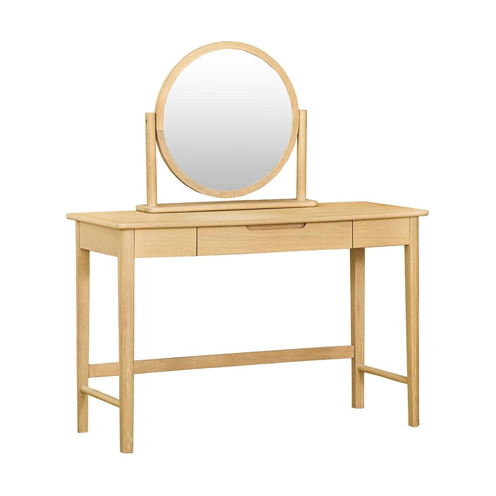 The mirror’s round frame softens the clean lines of the dressing table, creating a balanced and elegant look. Designed to sit perfectly with the Twyford Oak 1 Drawer Dressing Table and Twyford Oak Padded Dressing Stool, it brings both practicality and understated style to your daily routine.