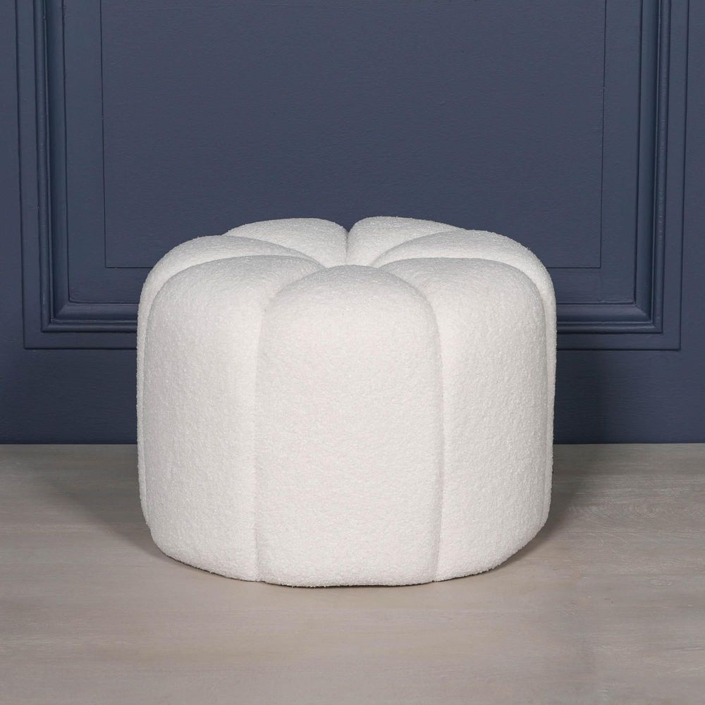 Item Code: AV380 Boucle fabric upholstered petal shape design round stool in a white colour finish.