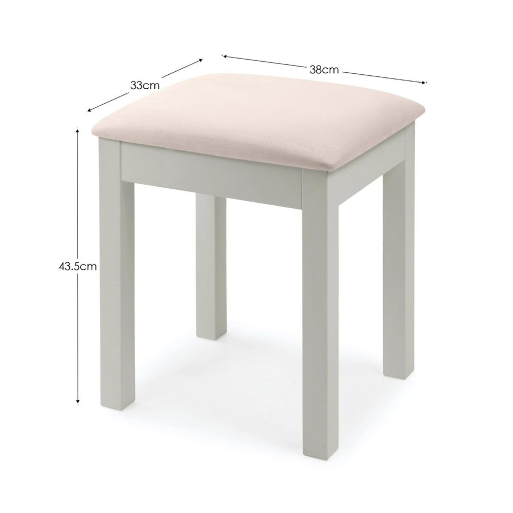 Item Code: MAI012 Maine is an elegant New England style range of bedroom furniture. The combination of exquisite dove grey lacquered finish with characteristic side panelling and detailed chamfered cabinetry makes for a soothing and refined aesthetic with timeless appeal, while delicate pewter handles add the perfect finishing touch. The Maine Dressing Stool has an upholstered padded seat, the perfect match for the Maine Dressing Table.