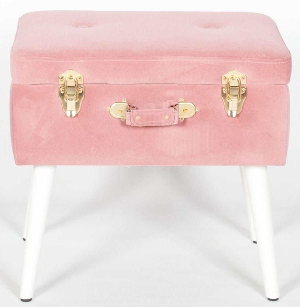 Item Code: AV120 This stylish stool is sure to add a touch of elegance to any room. Crafted from soft velvet fabric and sturdy wood, the pink and white design adds a touch of modernity. Perfect for any bedroom or living room, this assembled piece provides a striking accent and comfortable seating. Make a statement and add elegance to your room with this pink velvet suitcase stool and white legs.