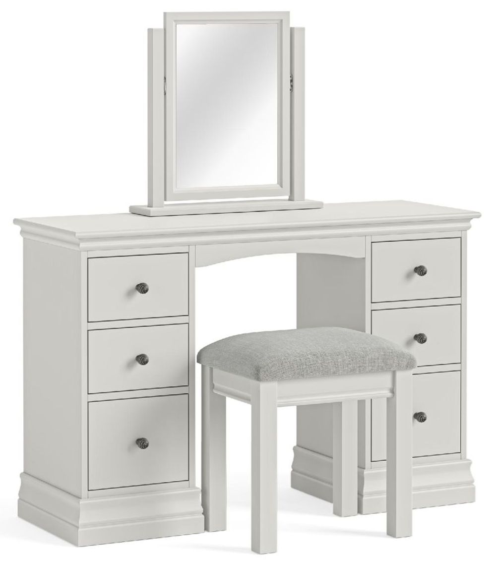 The Bordeaux Cotton Padded Dressing Stool combines comfort, practicality, and classic design, making it an essential addition to your bedroom. Crafted from solid wood and hand-painted in a soft Cotton finish, it reflects the quality and timeless style of the Bordeaux Collection. The soft grey padded seat provides a comfortable place to sit while getting ready, blending elegance with everyday functionality.