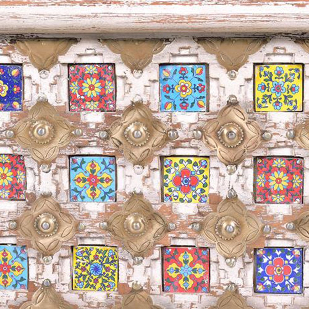 Item Code: 6574 Carved Mango Tree Wood Trunk With Maiolica Tiles And Bronce Details