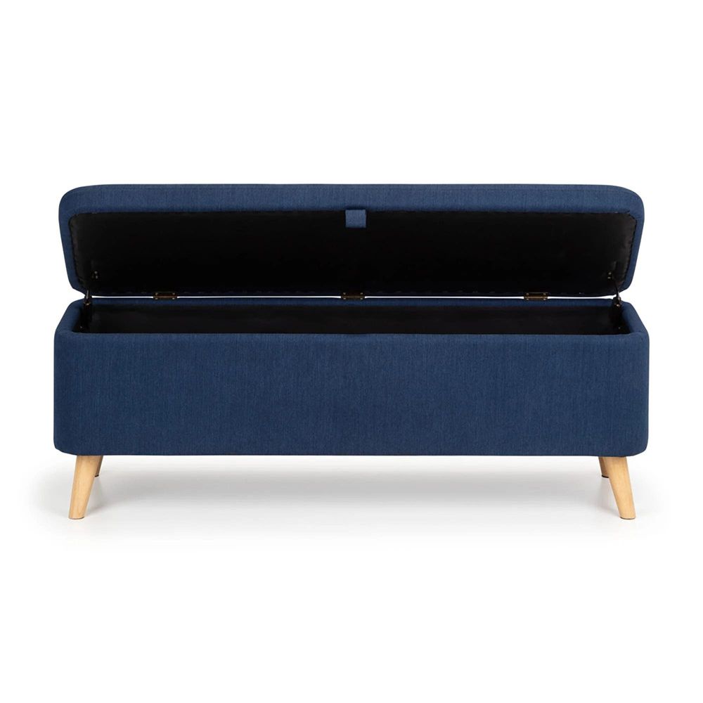 Item Code: AST102 Perfectly proportioned to sit at the end of the Julian Bowen Astrid bed, this contemporary Astrid blanket box is upholstered in a crisp blue linen fabric. This contemporary, Scandinavian design fits perfectly with a wide range of bedroom decor. The perfect storage for your cushions, linens, or duvets with the ease of soft close hinges.