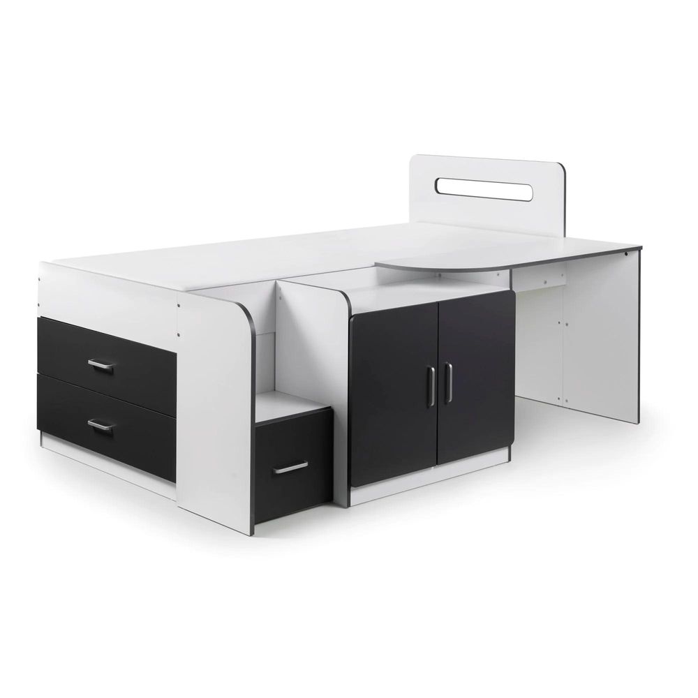 Item Code: COO101 An innovative and highly functional cabin bed offering incredible versatility with three storage drawers, a cupboard, shelf and desk neatly integrated into a sharp, contemporary design. A sleek matt finish in white and charcoal grey makes the Cookie Cabin Bed the perfect combination of style and practicality for any children's or teenager's bedroom.