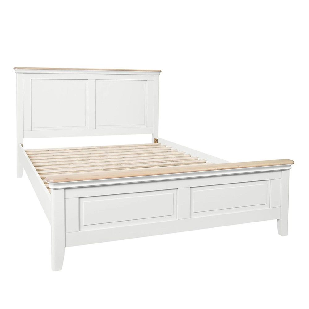 Item Code: LYD042W This stunning bed frame will add style and softness to your sleeping space. Offered primarily in a light mid grey paint, the soft graceful curves, elegant panels and lightly finished solid oak tops will create a calm, comfy and peaceful place to lay head at night after a long day.Available in a double 4ft 6in or a king 5ft.Supplied with solid plywood plats