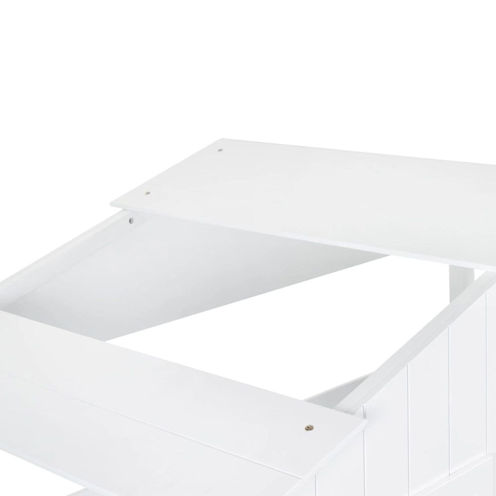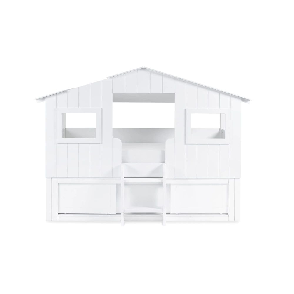Item Code: ACO001 Step into a whimsical woodland wonderland with the Acorn Treehouse Midsleeper & Storage Unit, transforming your child's bedroom into an enchanting escape. This magical treehouse-style bed boasts a charming white panelled front and rooftop adorned with two square windows, sparking imaginative adventures. Watch as your little explorer climbs into their cosy retreat using the two small step ladder and gets lost in endless daydreams while peering out of the roof gap. Below awaits a slide-door storage unit, the perfect hideaway for stowing books and toys - ensuring a tidy and organised space.
