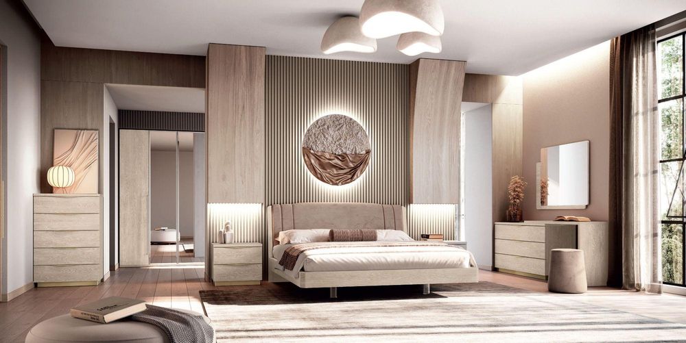 Item Code: 154LET.25AV/000RET.167O The Denali bedroom features a distinctive design characterized by contemporary shapes and clean lines. This modern space radiates a sense of serenity and sophistication, turning every moment spent within it into a unique experience. Refined details with a timeless elegance. The solid wood frame of the headboard is enhanced by the softly rounded op padding. Attention to small details, such as the craftsmanship of the ertical stitching, creates an inviting and sophisticated ambiance in the bedroom. The wave-shaped handles in satin champagne fi nish, add an exquisite touch of Italy to the space. Their gentle, rounded contours infuse the room with a sense of delicacy, design, and distinct personality. Modular wardrobes available 228 cm tall in various sizes to meet your specific needs.