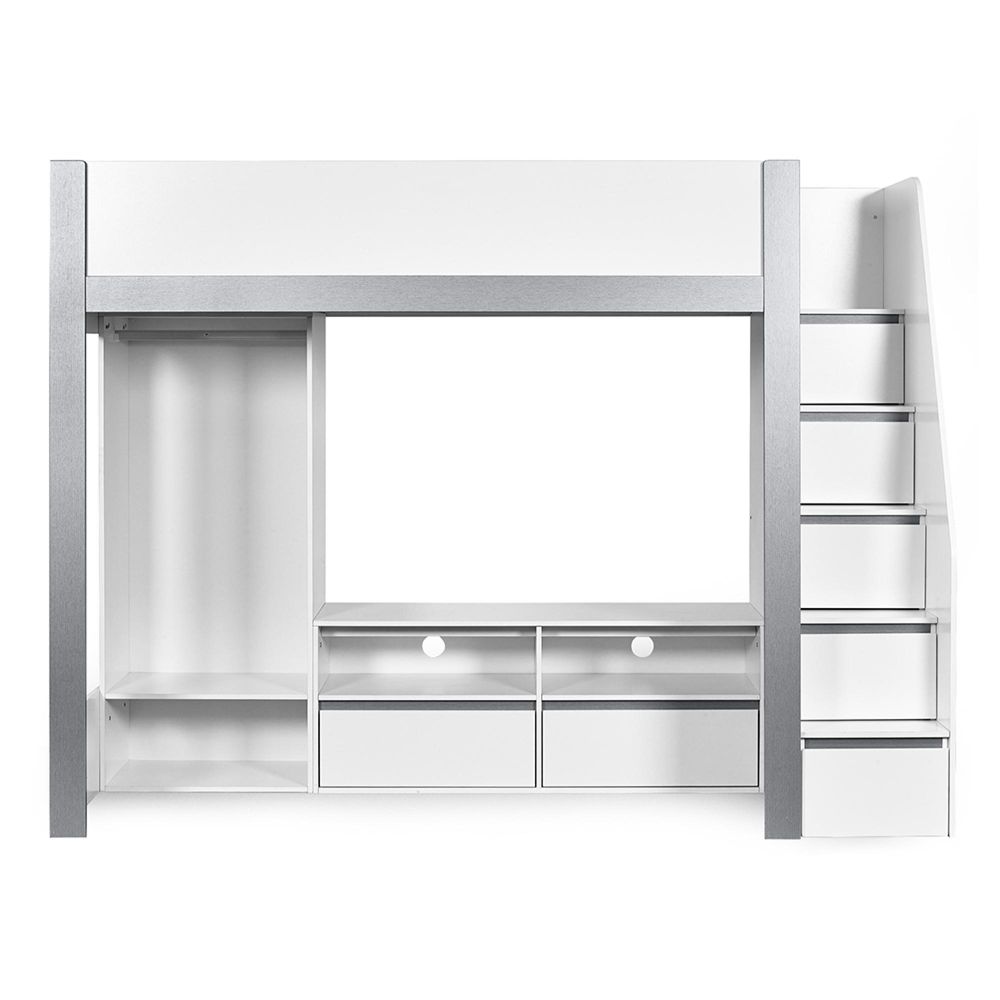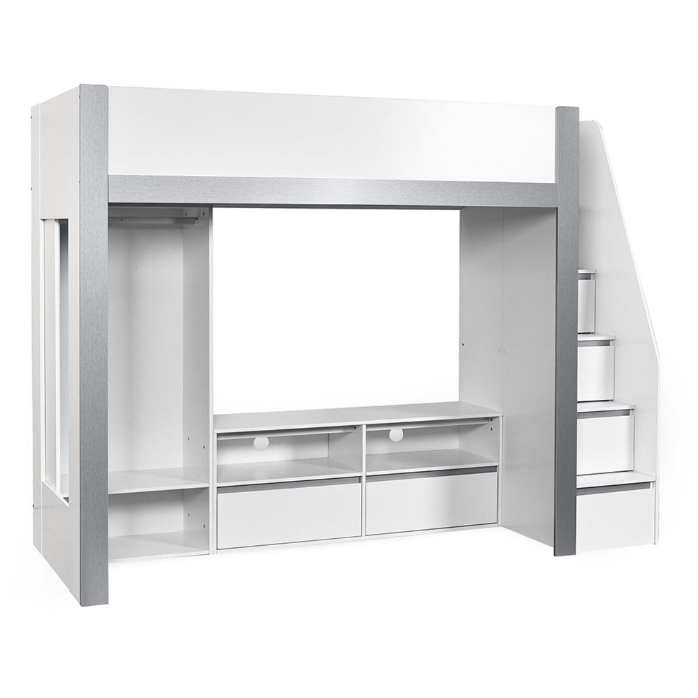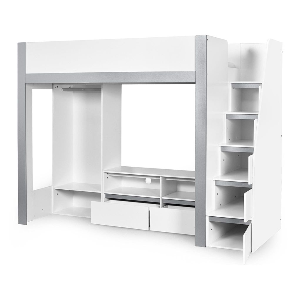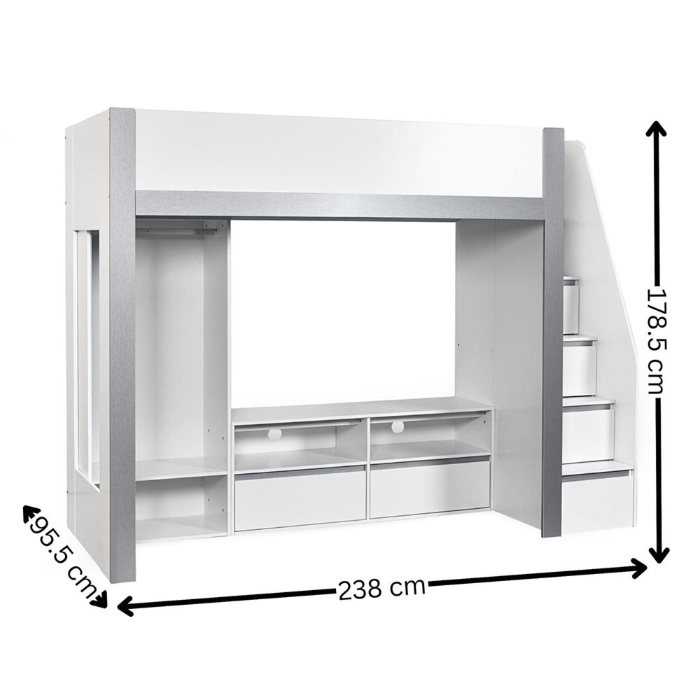 Item Code: GAI001 Make bedtime fun with this multi-functional high sleeper bed, thoughtfully designed to maximise every inch of space in your child?s room. With its elevated high rise bed design, it opens up the floor beneath for a full-width wardrobe, versatile open shelving and a dedicated space to fit a TV frame or entertainment unit. It blends modern style with everyday functionality, offering multiple storage compartments for clothing, books, toys, and media devices. Even the sturdy fixed ladder doubles as practical storage, with built-in compartments perfect for display or daily essentials. Finished in a sleek white and silver colourway and crafted from durable wood, this loft bed is a smart and stylish solution for growing children. Mattress and TV sold separately.