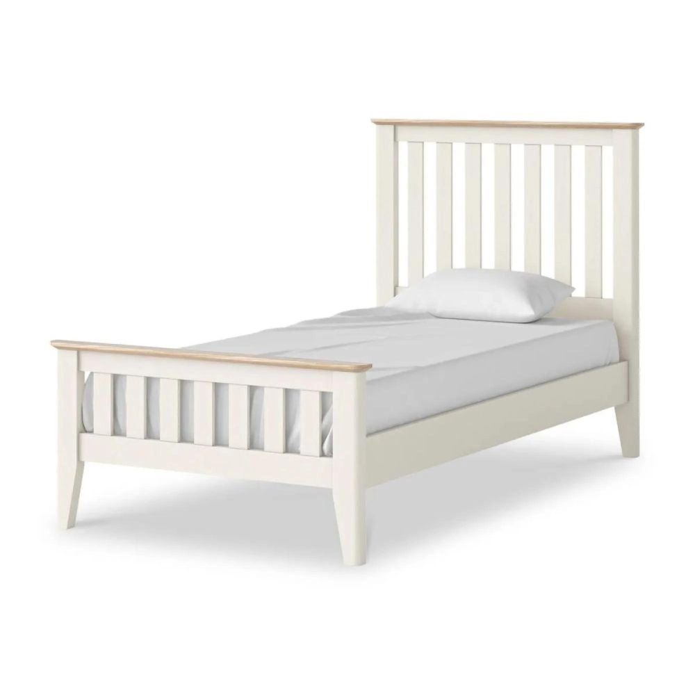Bring timeless charm and dependable comfort to your bedroom with the Marlow White Painted 3ft Single Slatted Bed. Crafted with a refined balance of natural oak veneer and a smooth painted finish, this bed blends durability with understated elegance. Its slatted frame offers both strength and breathability, while the gently curved edges and tapered legs give it a contemporary yet classic look that will complement a wide range of interiors.