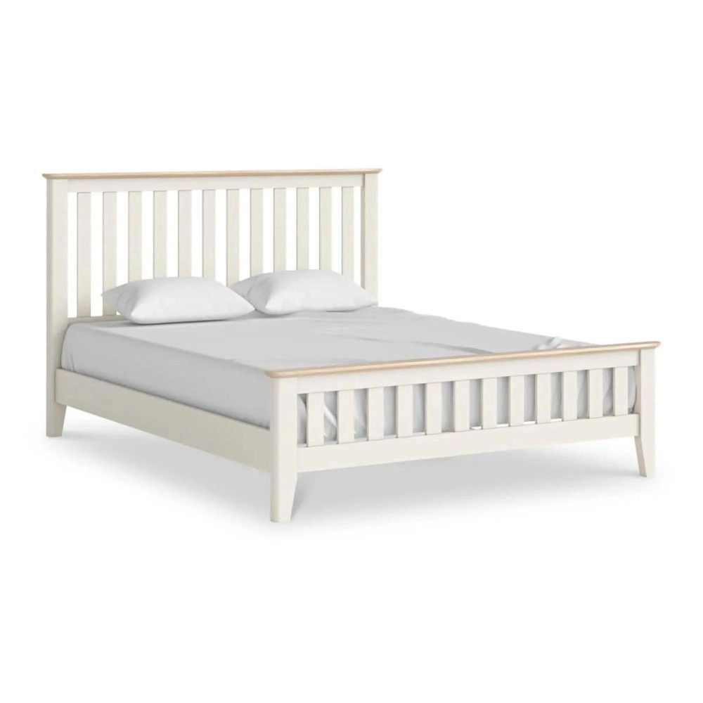 The Marlow White Painted 5ft King Size Slatted Bed offers the perfect balance of timeless design, sturdy construction, and refined detail. Crafted with a solid wooden frame, its elegant slatted design brings both style and strength, while the gently curved edges and tapered legs give it a soft, contemporary finish. The headboard and footboard are topped with natural oak veneer, adding a warm contrast to the sleek painted frame, available in coconut white or navy.