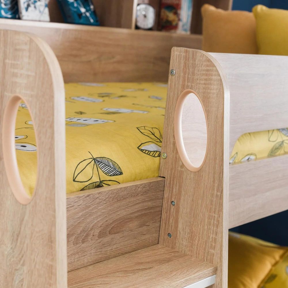 Item Code: ORI001 Orion is a contemporary, innovative bunk bed presented in an on-trend Sonoma Oak finish. Orion combines style with great practicality and includes a handy pull-out drawer and extensive shelving for kids' books and toys, with a subtle raised lip to prevent anything slipping down the back. The lower bunk is positioned close to the ground, making it ideal for smaller children, while the robust ladder features attractive cut-out handles and optional glow-in-the dark strips on the steps for added safety.Due to Bunk Bed Safety Regulations, only the Premier or Platinum Mattresses are suitable for use on the upper bunk.