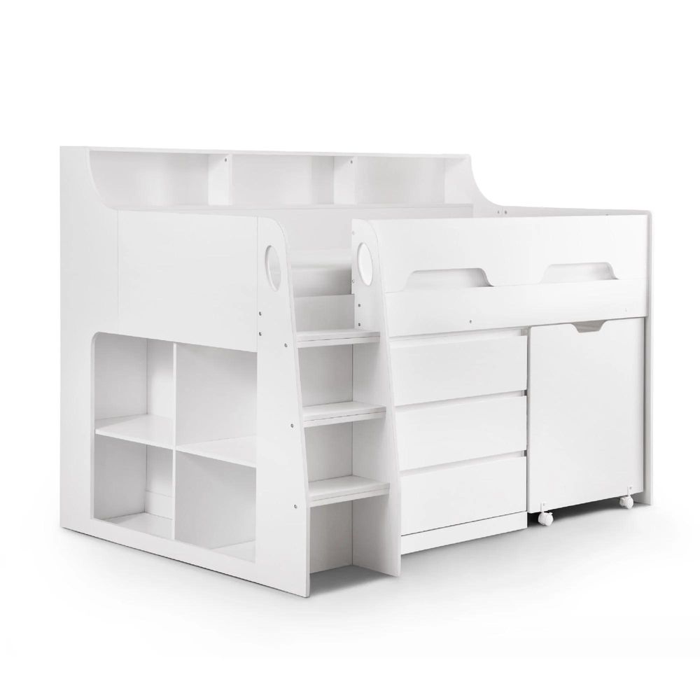 Item Code: JUP101 The Jupiter Midsleeper is an ideal space saver, featuring a chest of drawers, various shelves and a pull out desk. Available in two colour options, White or Grey Oak, the Jupiter is the perfect match for any kids bedroom, creating a fresh modern design. The robust ladder features beautiful cut out handles, with glow in the dark strips on the steps for added safety.