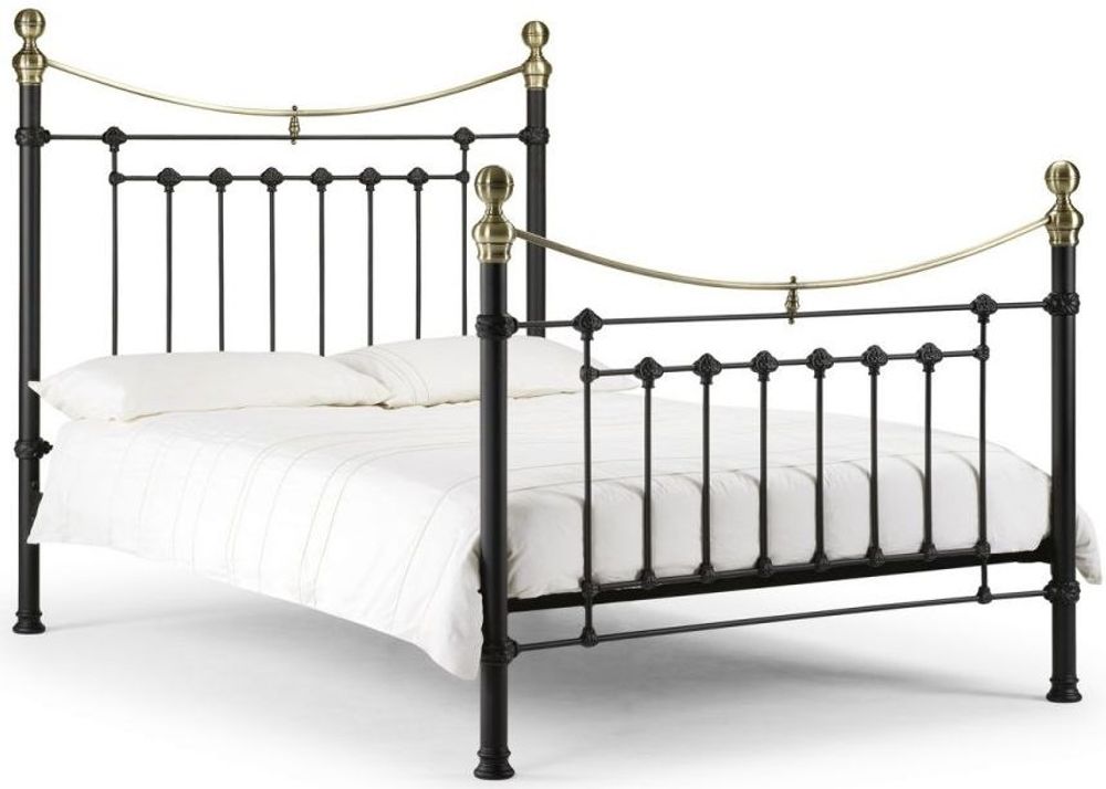 This is a traditional, Victorian inspired bedstead with attractive brass embellishments in a powder coated steel satin black finish. The Victoria is an imposing bed with a striking high headboard and matching footboard, whose timeless style complements a wide range of interior styles. A sprung slatted base ensures a comfortable night's sleep and prolonged mattress life. Available in 90cm, 135cm and 150cm sizes.