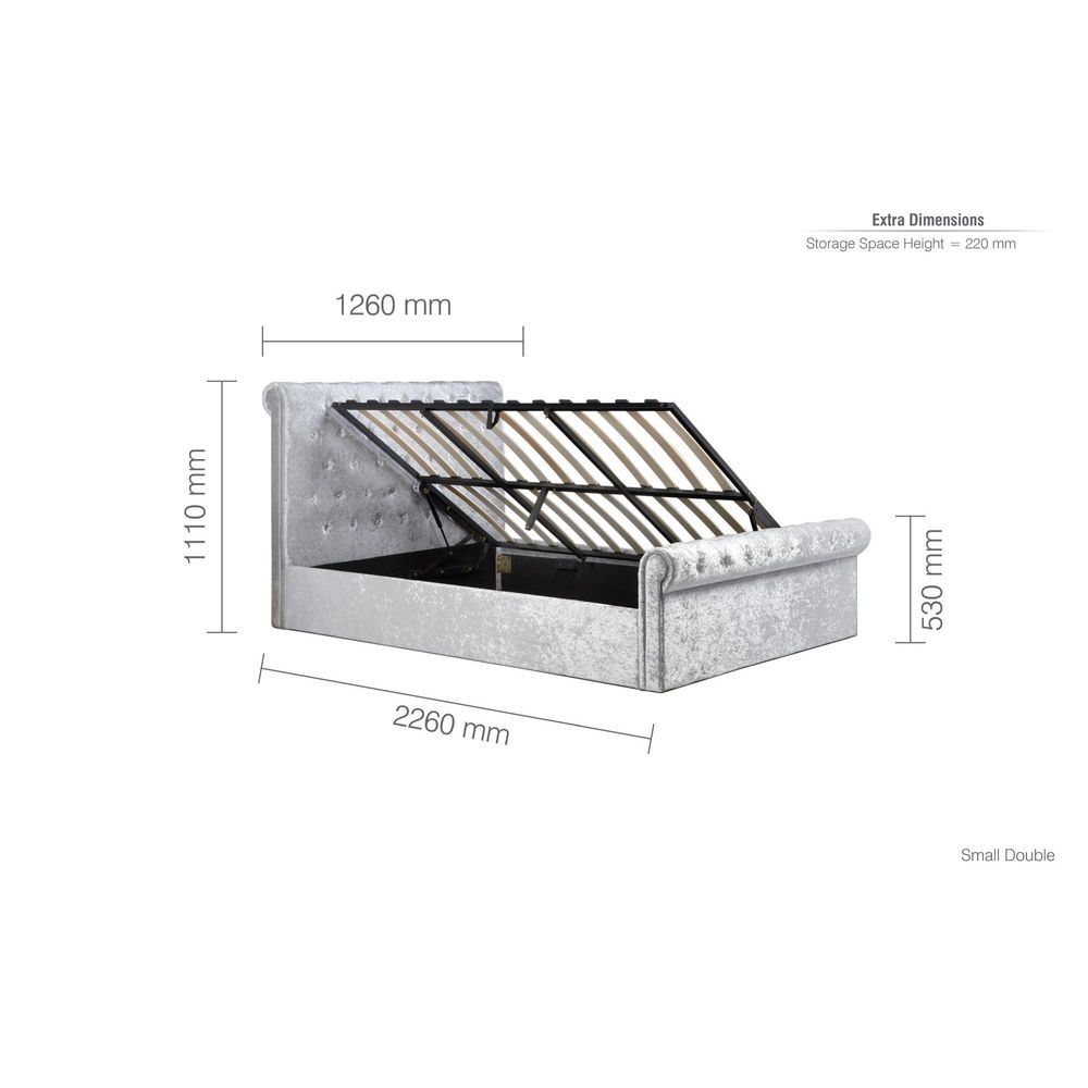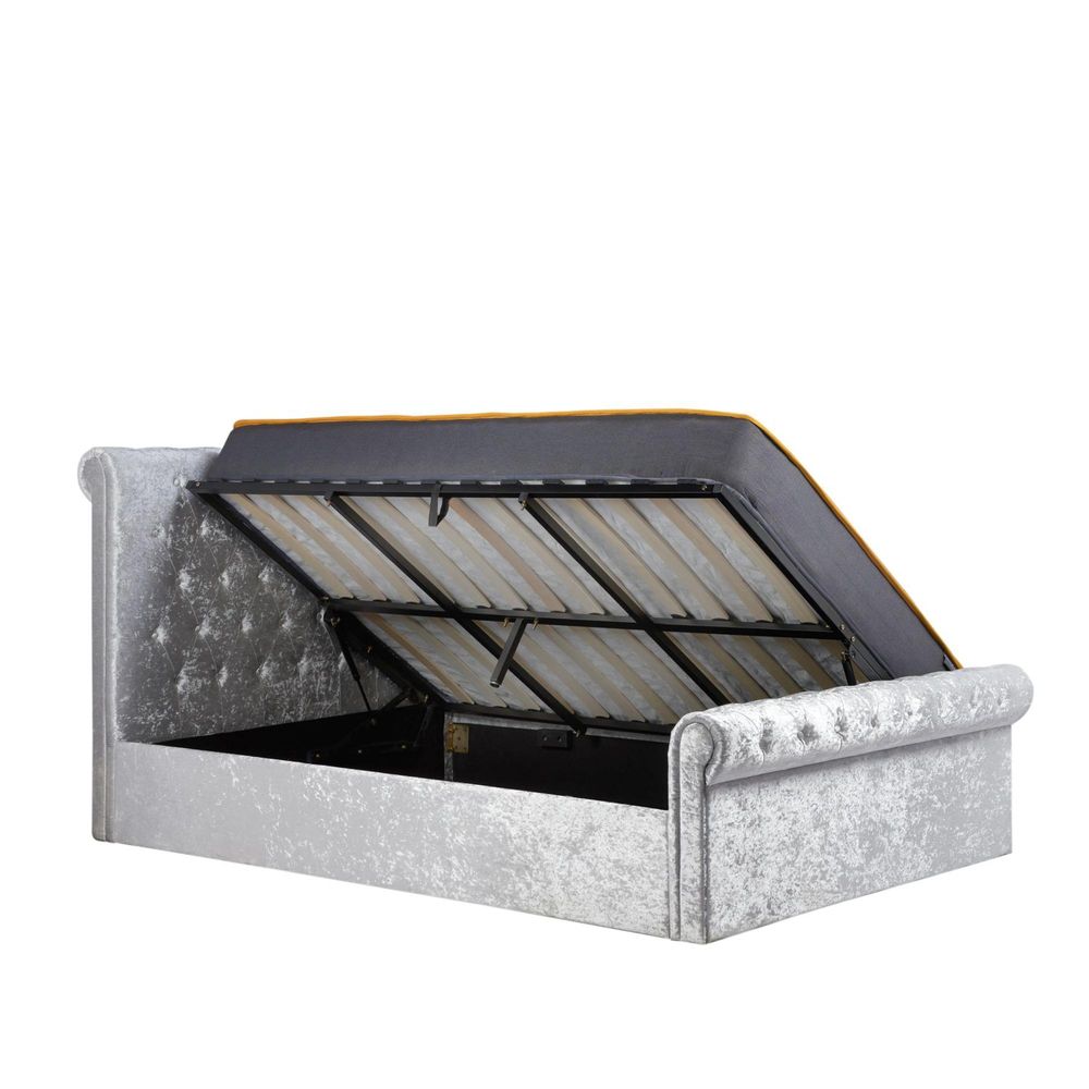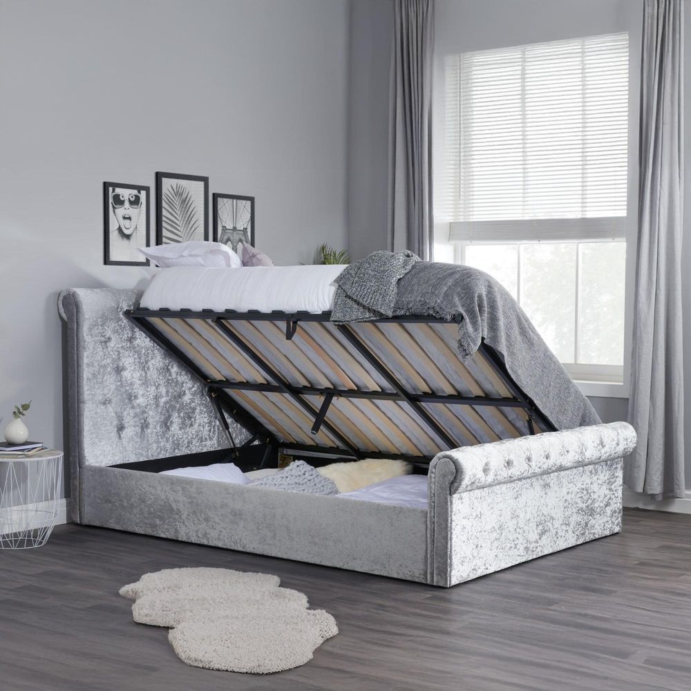 Sienna Side Ottoman Storage Bed - Steel Crushed Velvet Fabric - Sizes Available