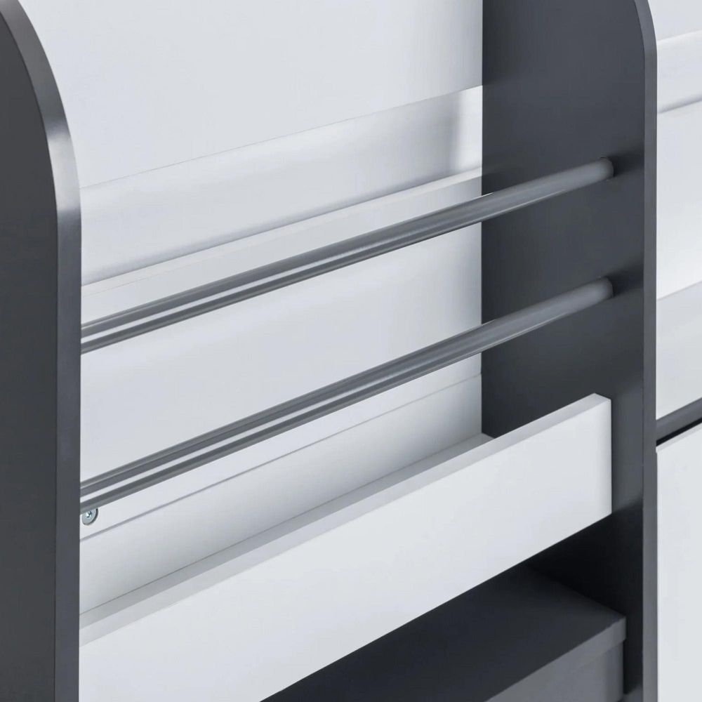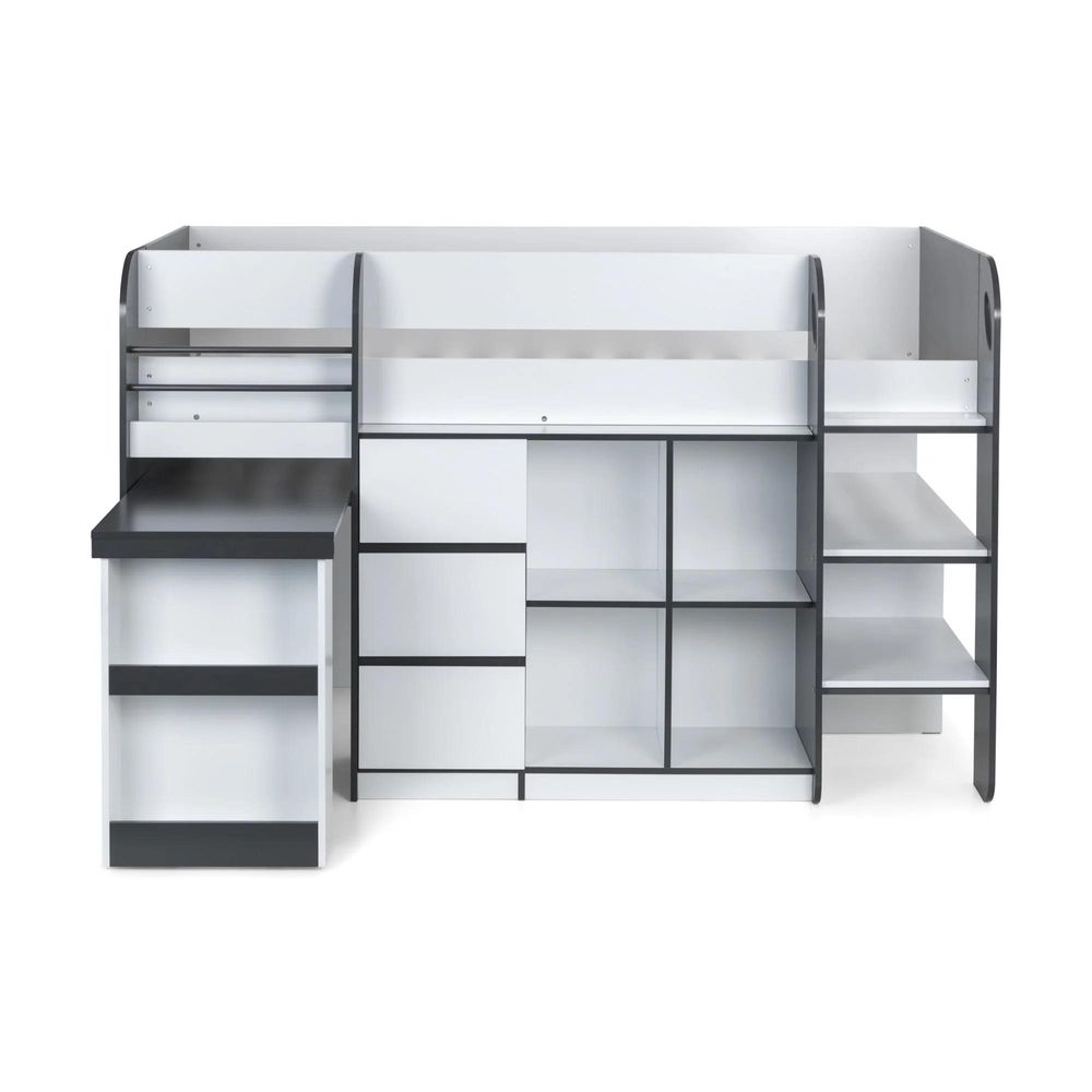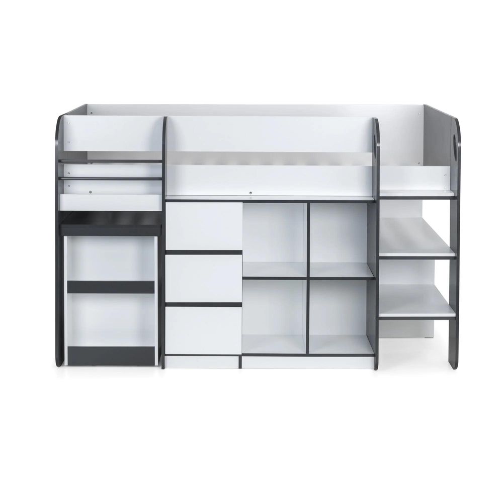 Item Code: SAT401 Offering a compact, space saving design, the Saturn Midsleeper features a bookcase, 3 drawer chest, and a cube bookcase saving floor space for toys and more. Finished in a modern charcoal grey and white, this midsleeper is perfect for a wide range of childrens bedroom decor. Crafted from sturdy particleboard, this bed has a wooden slatted base and fits a UK single mattress.
