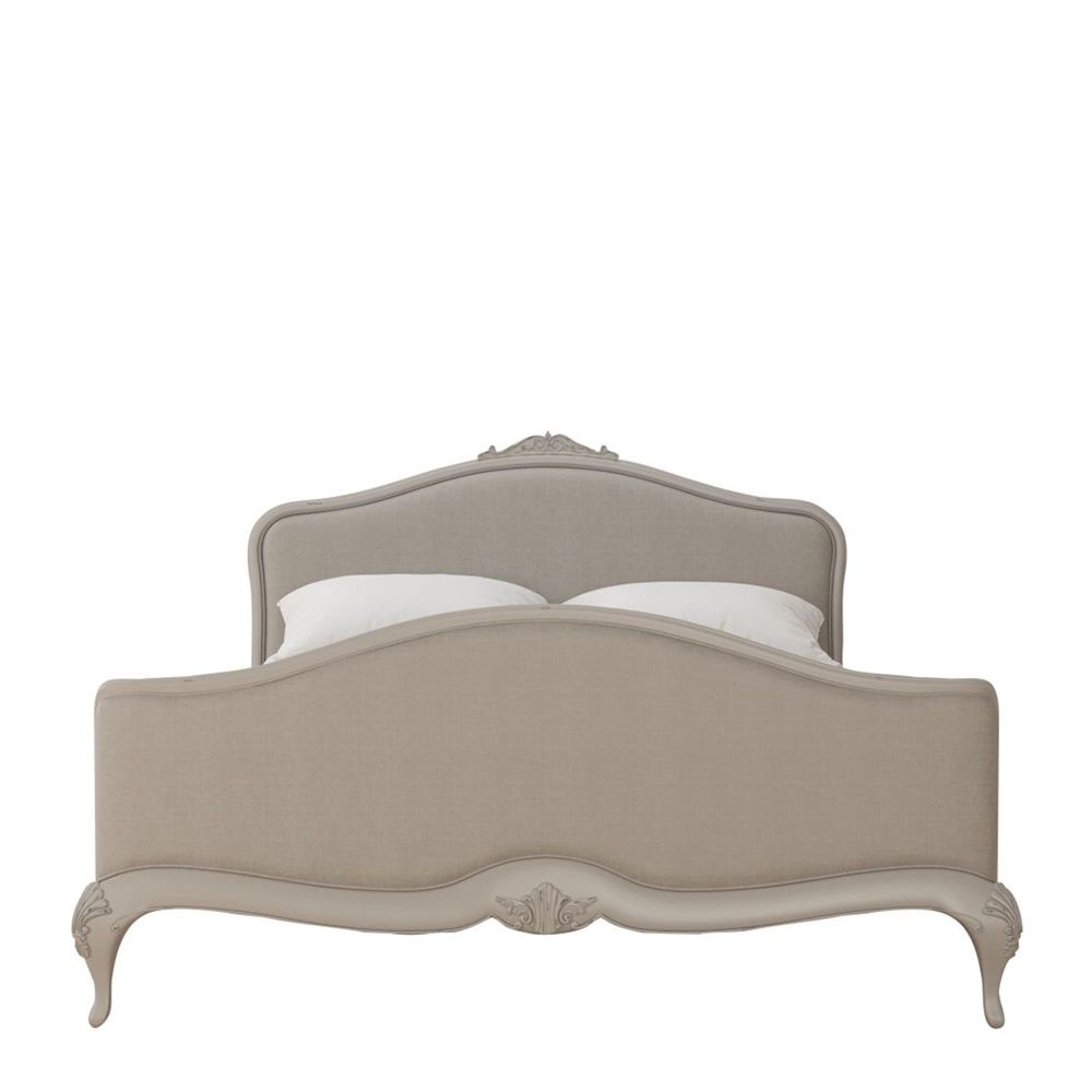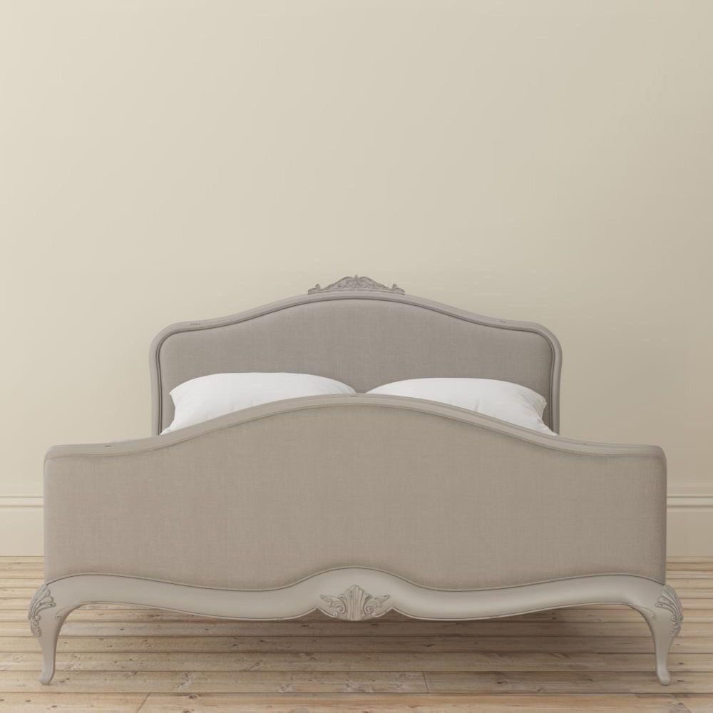 Crafted from solid poplar with birch veneers, this bed features a soft grey painted finish with lightly distressed edges, providing a subtle aged character. The fabric upholstered headboard and footend offer a plush, comfortable feel, while the sprung slatted base ensures optimal support for a good night’s sleep. Classic cabriole legs and carved detailing complete its refined French-inspired look.