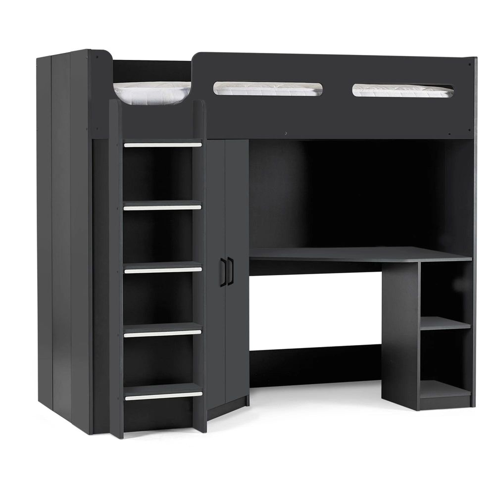 Item Code: HER012 Designed with perfect functionality, the Hercules Highsleeper is the ultimate bed for your child. The angled wardrobe provides ample space for clothing, whilst the built-in shelving is great for all their files, folders, trainers, or games to stay organised. With glow-in-the-dark steps, and colourways of woodgrain and anthracite, white, and anthracite, there is an option for any interior style.