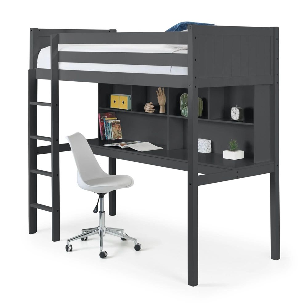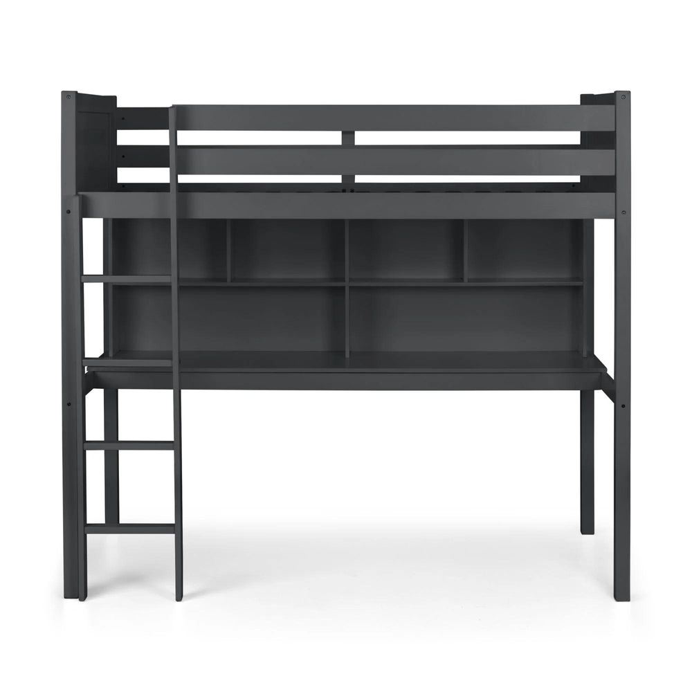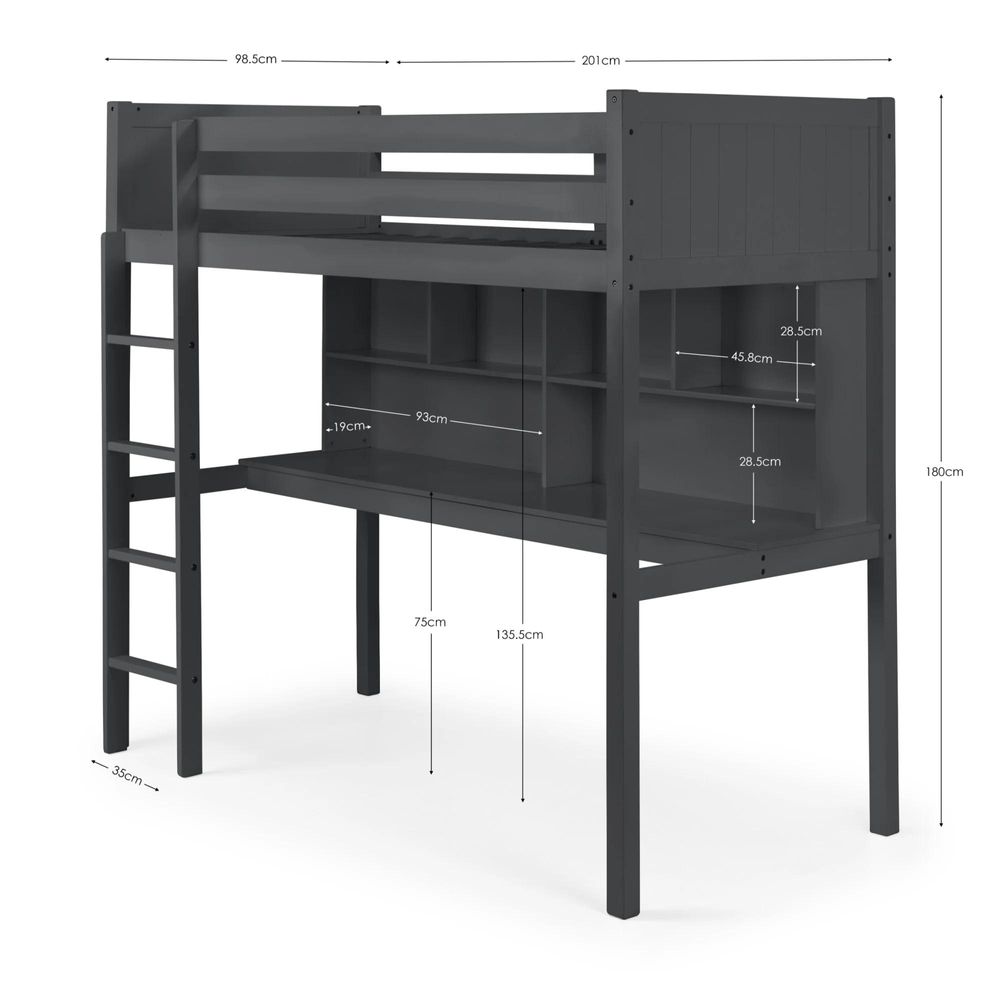 Item Code: TIT003 Crafted from Malaysian Hardwood and MDF, the Titan High sleeper is finished in an anthracite lacquer, matching with any bedroom decor as they grow. Offering a classic design with panelled detailing, this high sleeper features a workstation underneath, complete with shelves and room beneath for extra storage.