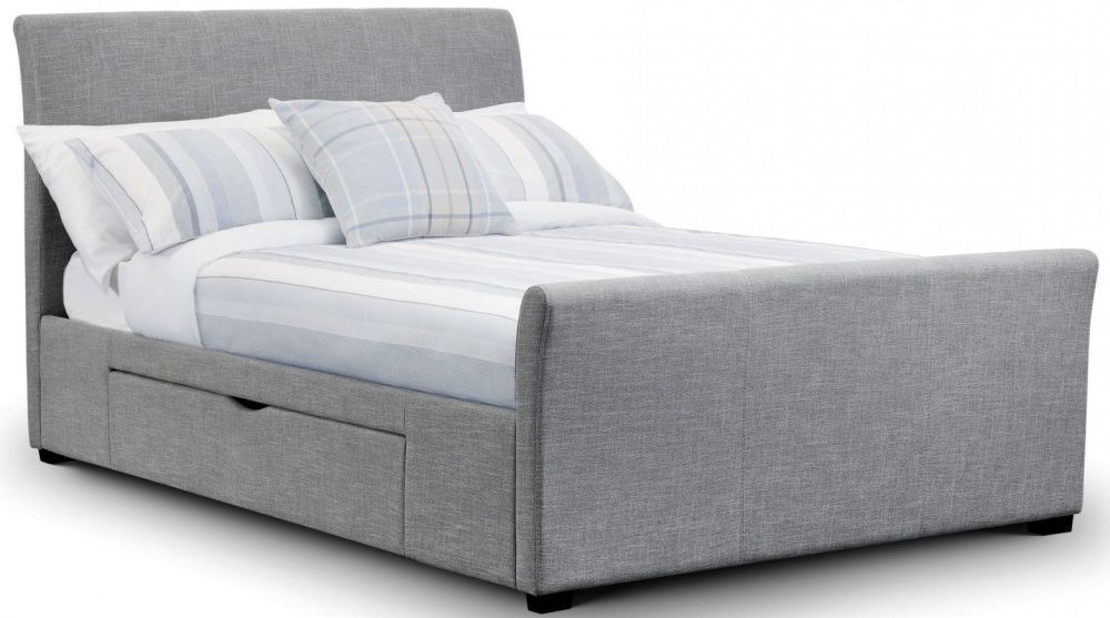 Item Code: CAP001 A contemporary curved design fabric bed with two large storage drawers and finished in soft light grey linen style fabric. An elegant addition to any bedroom.