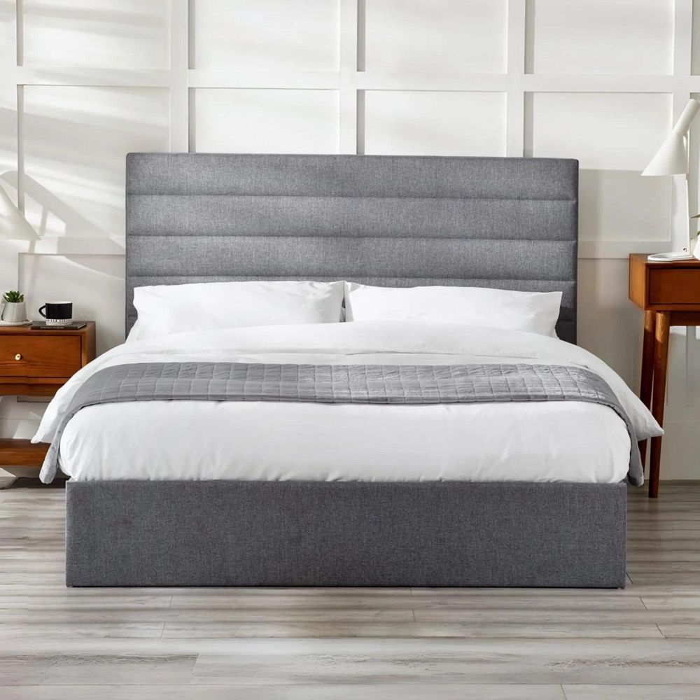 Item Code: MER301 The Merida bed has a horizontal tufted headboard finished in an exquisite grey linen which is likely to transform any bedroom space. The ottoman storage space and timeless design is perfect for any decorative space, and made from solid materials, making it a durable yet beautiful addition to your home.