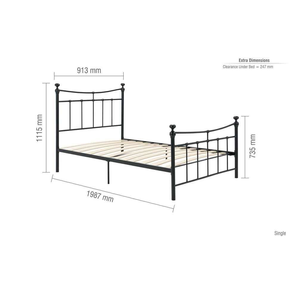 Item Code: EMIB3BLKV2 A charming centrepiece, the Emily has beautiful curved rails and carefully designed finials to give a charming traditional feel. Constructed from steel with an epoxy powder coated paint process, the Emily is available in either a black or cream finish. This frame has a sprung slatted base giving natural bounce, adjusting to where pressure is most exerted to provide greater comfort. The maximum weight load for the 3' frame is 100 kg, all other frames is 250 kg.