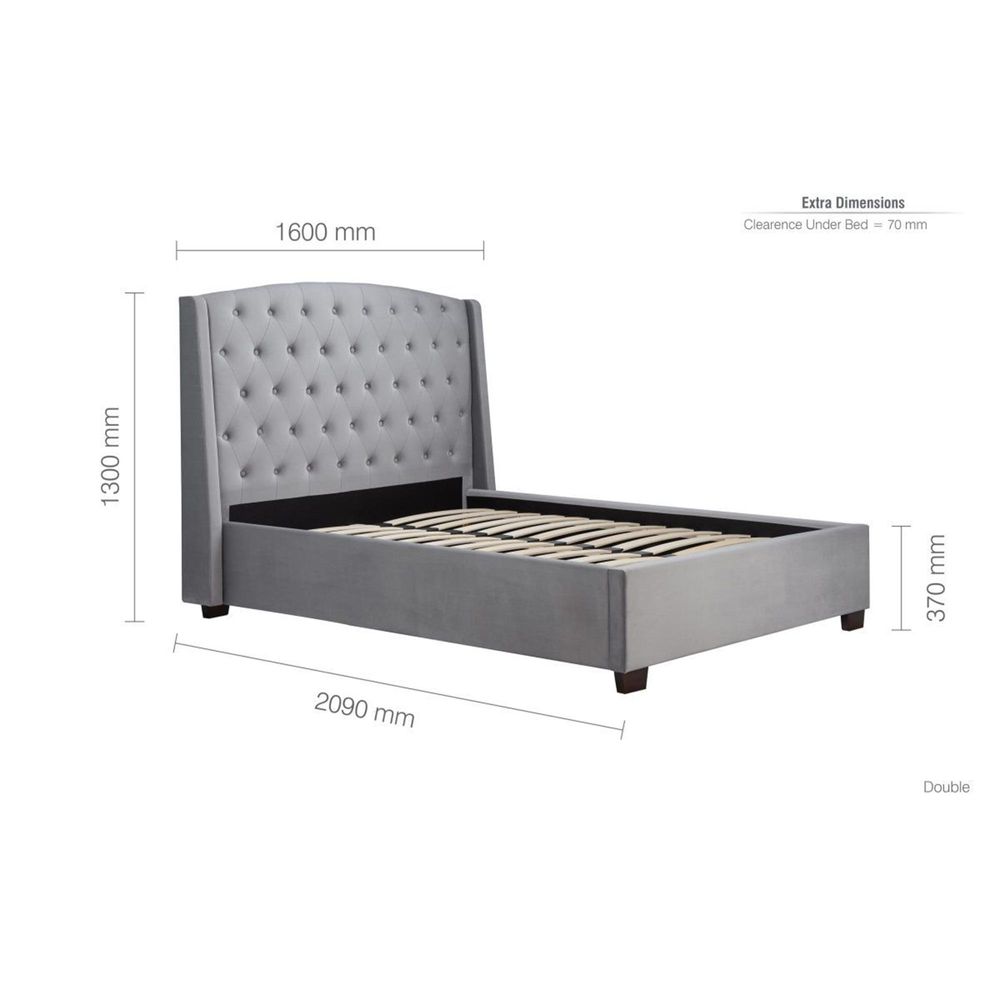 Item Code: BALB46GRVV2 Make a grand style statement with this elegant contemporary bed frame. The Balmoral bed is upholstered in a luxurious grey velvet and features a wingback headboard with beautiful tufted detailing. Featuring a sprung slatted base to give natural bounce, this bed adjusts to where pressure is most exerted for greater comfort. Add a touch of elegance to any style bedroom with the Balmoral Bed. The maximum weight load for the 4"6 frame is 300 kg, the 5" frame is 400 kg, and the 6" frame is 450 kg.