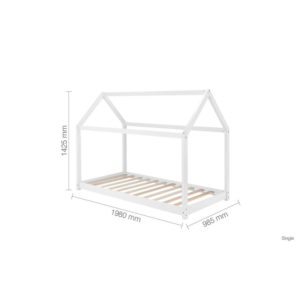 Item Code: HOUB3WHTV3 It's time for your kid's independence with their very own house (bed). The wooden bed frame in the shape of a house is the perfect bed for your little one's bedroom. This frame has a solid slatted base for firmer support, allowing air to circulate beneath the mattress. The maximum weight load for this bed is 100 kg.