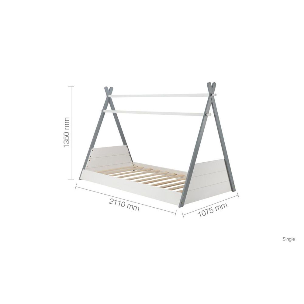 Item Code: TEPB3WTGV3 This Teepee children's bed is the perfect addition to any little adventurer's room. The cool look brightens up bedtime and the simple design can be easily personalised with fairy lights or even a canopy. This frame has a solid slatted base for firmer support, allowing air to circulate beneath the mattress. The maximum weight load for this bed is 100 kg.