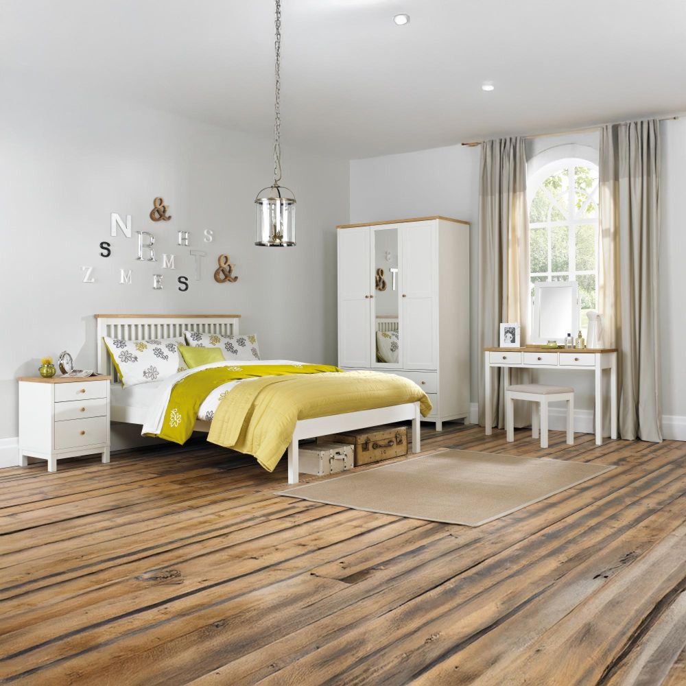 Item Code: 4803-54BD Combining a soft white painted finish with contrasting American oak veneers, the Atlanta Two Tone is a collection that complements both modern and traditional bedroom settings. With its clean and simple lines, it is a timeless range that offers versatility through its choice of storage cabinet options including an underbed drawer which comes with a protective dust cover. Practical and compact, the Atlanta Two Tone is finished in a hard-wearing lacquer with additional features such as superior sprung slatted bed base and conical wooden handle. The underbed drawer does not fully fit beneath the 122cm bedstead, owing to the position of the bedstead centre leg.